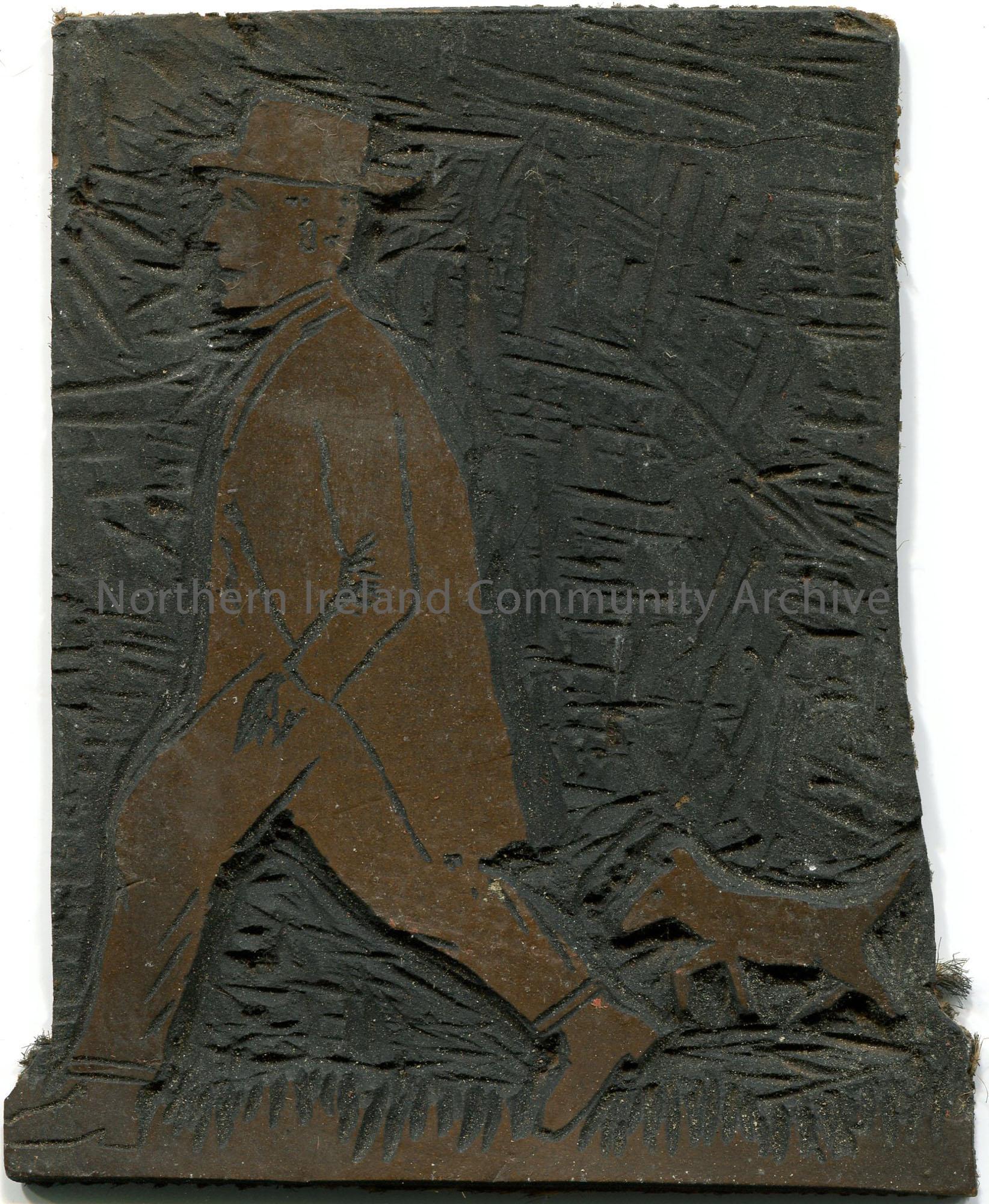 Rectangular shaped linocut with red/brown colour backing. Reverse image of a man wearing a hat with a small dog following behind.