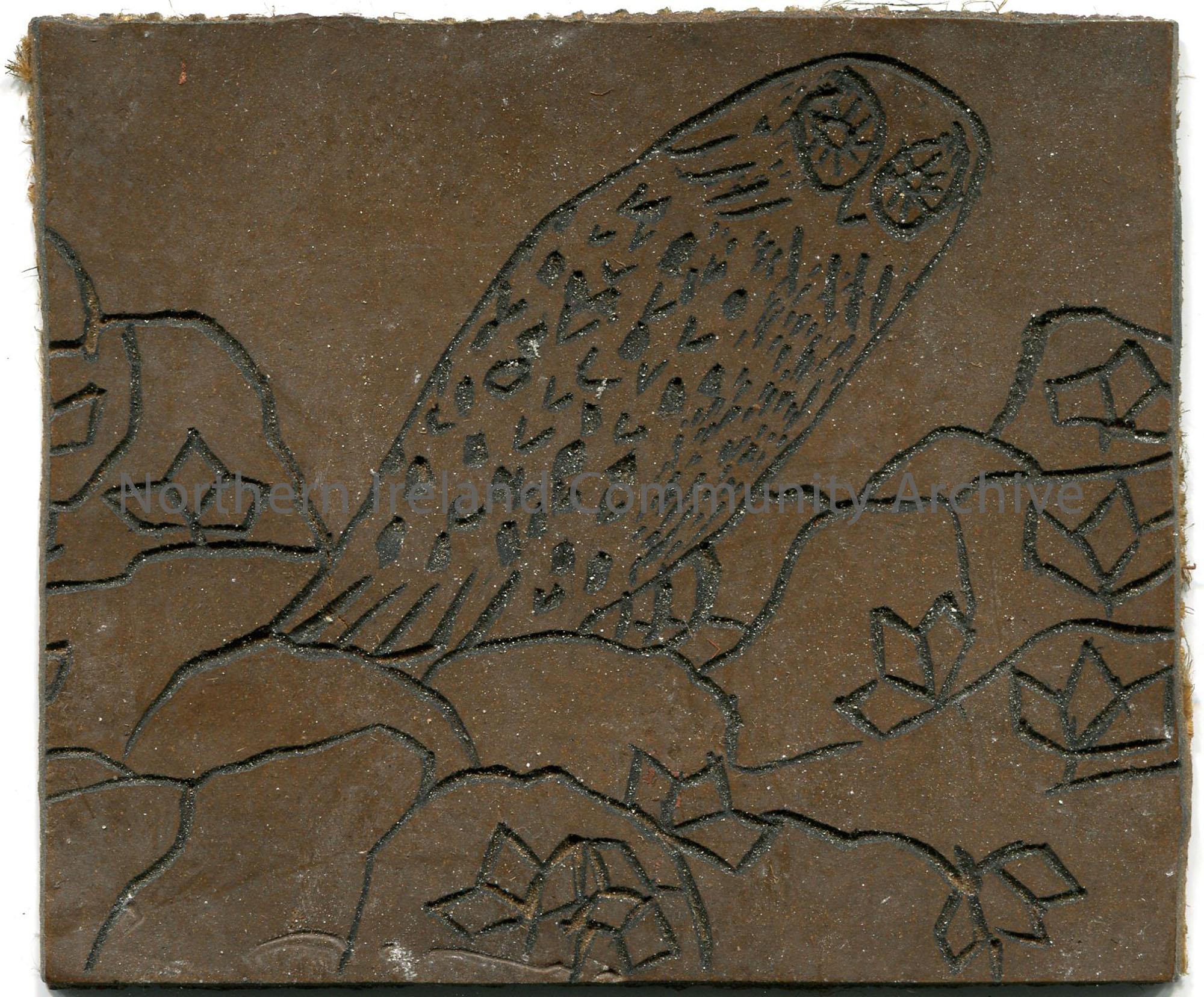 Rectangular shaped linocut with red/brown colour backing. Reverse image of an owl on branches.