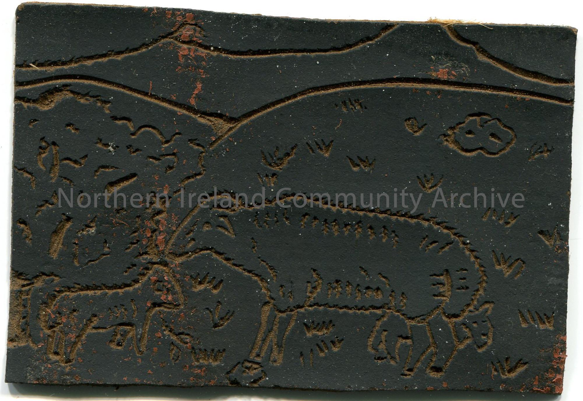 Rectangular shaped linocut with red/brown colour backing. Reverse image of what appears to be a ram or sheep with lambs in a field.