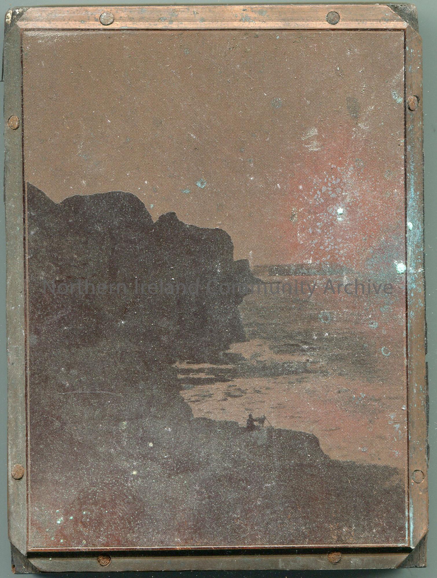 Rectangular wooden block with a metal plate nailed to it. Photographic image on metal is of the White Rocks - cliffs and sea with a figure, possibly fishing, in the foreground.
