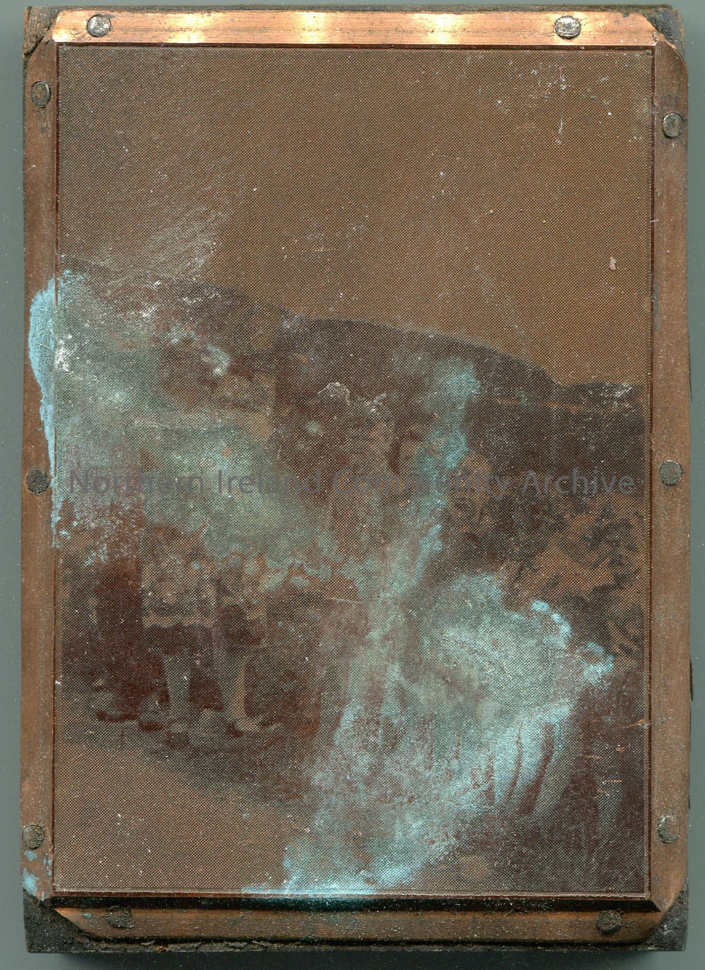 Rectangular wooden block with a metal plate nailed to it. Photographic image on metal of 5 children standing looking at the camera and a woman holding a child in her arms.