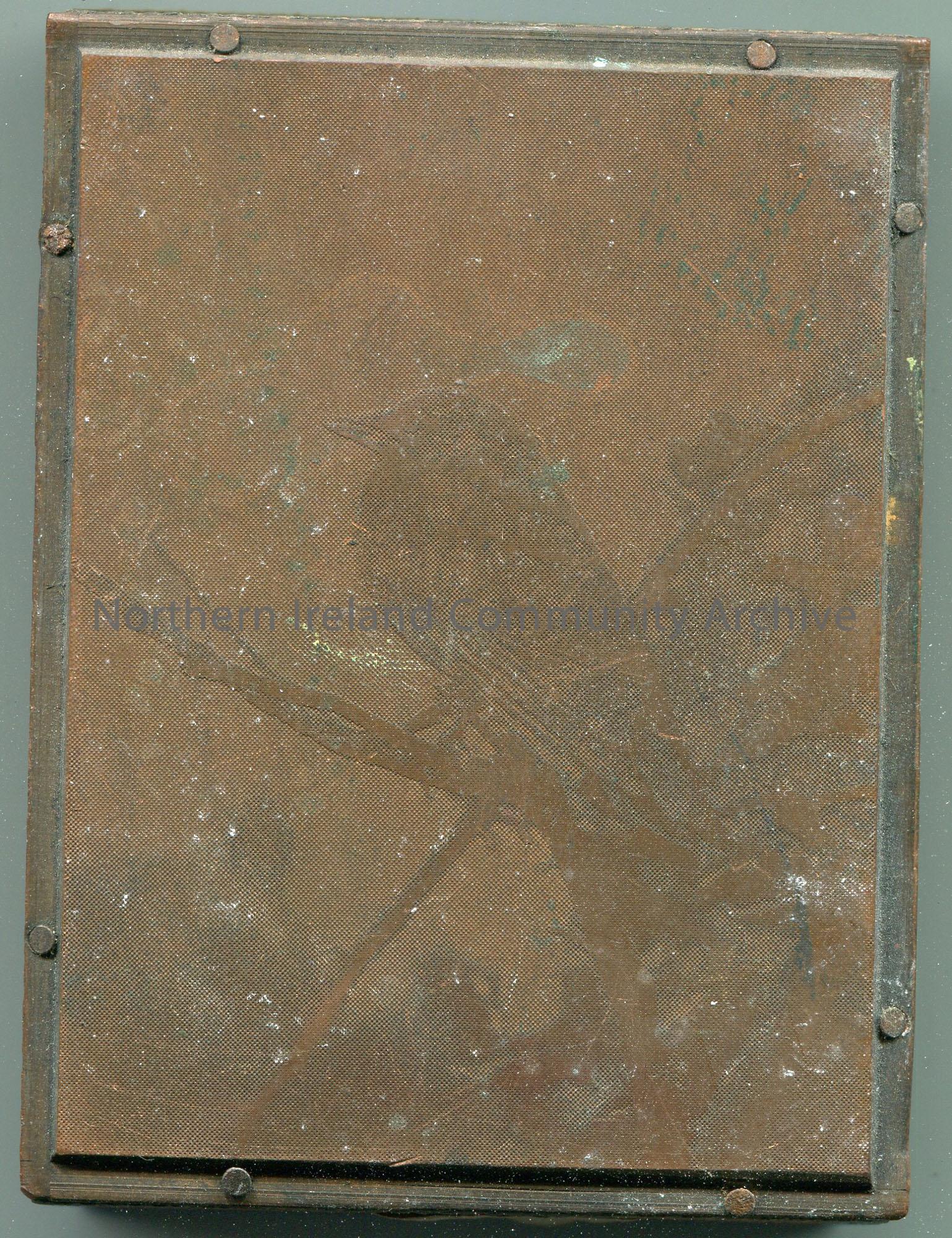 Rectangular wooden block with a metal plate nailed to it. Photographic image on metal of a bird sitting on a branch. 'Jackdaw' typed onto label which is stuck to one side of wood block.
