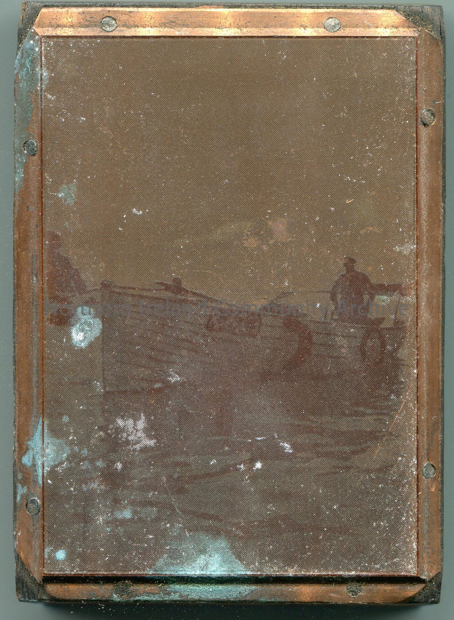 Rectangular wooden block with a metal plate nailed to it. Photographic image on metal of a boat in water. A man is standing to the back of the boat.