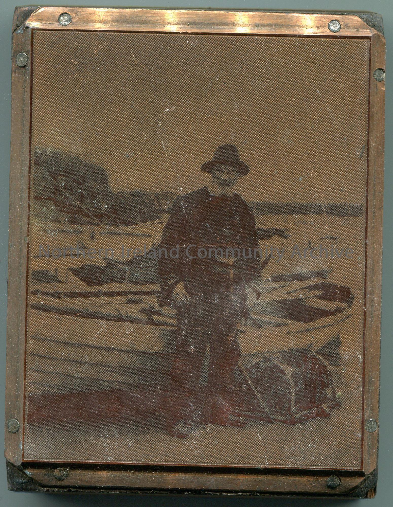 Rectangular wooden block with a metal plate nailed to it. Photographic image on metal of a man standing in front of a wooden boat.
