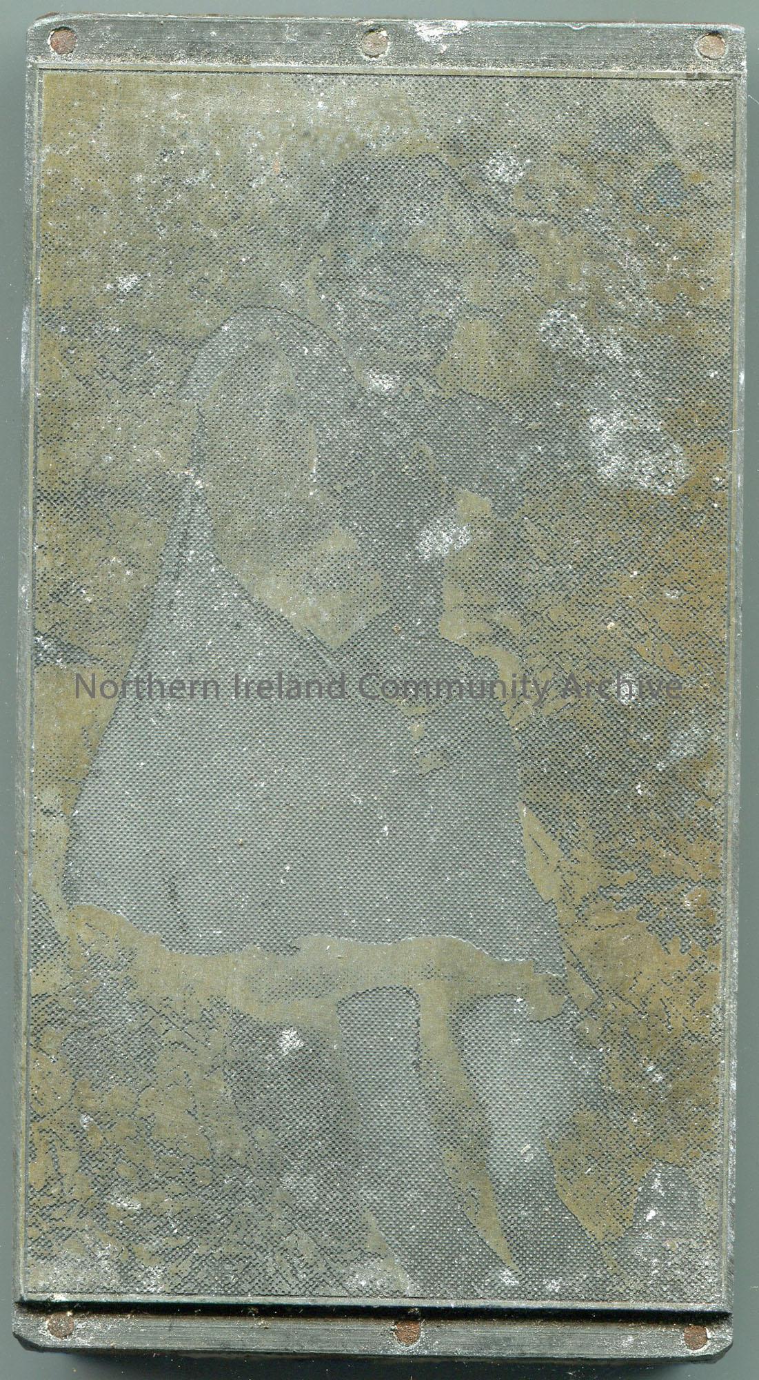 Rectangular wooden block with a metal plate nailed to it. Photographic image on metal of a young girl wearing a pinafore with bare feet on Rathlin. Nu…