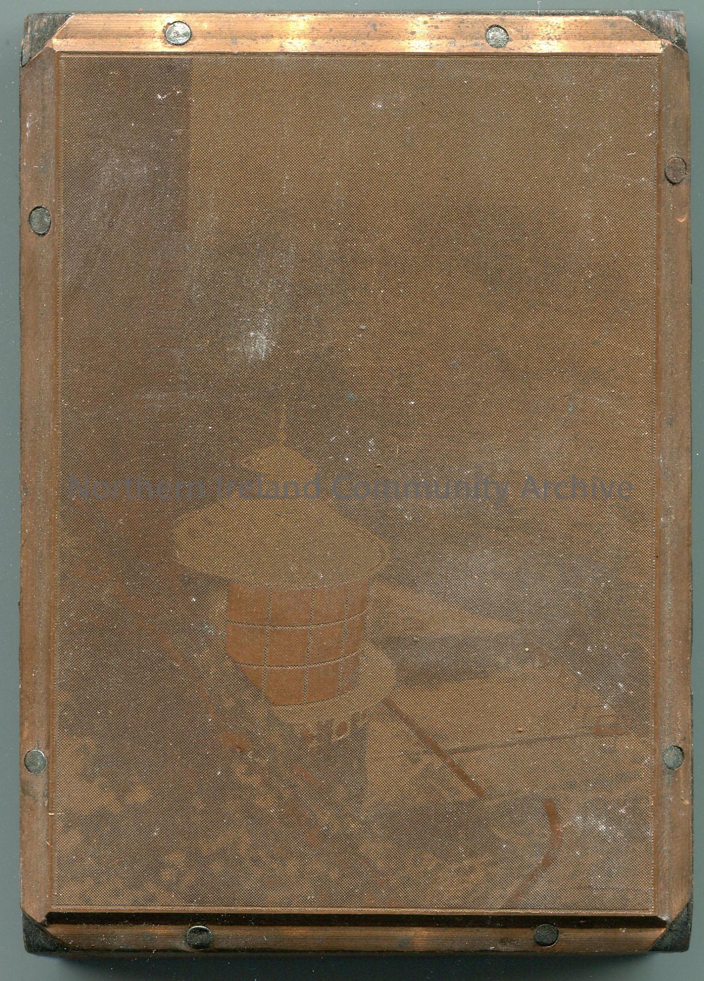 Rectangular wooden block with a metal plate nailed to it. Photographic image on metal of part of a lighthouse.