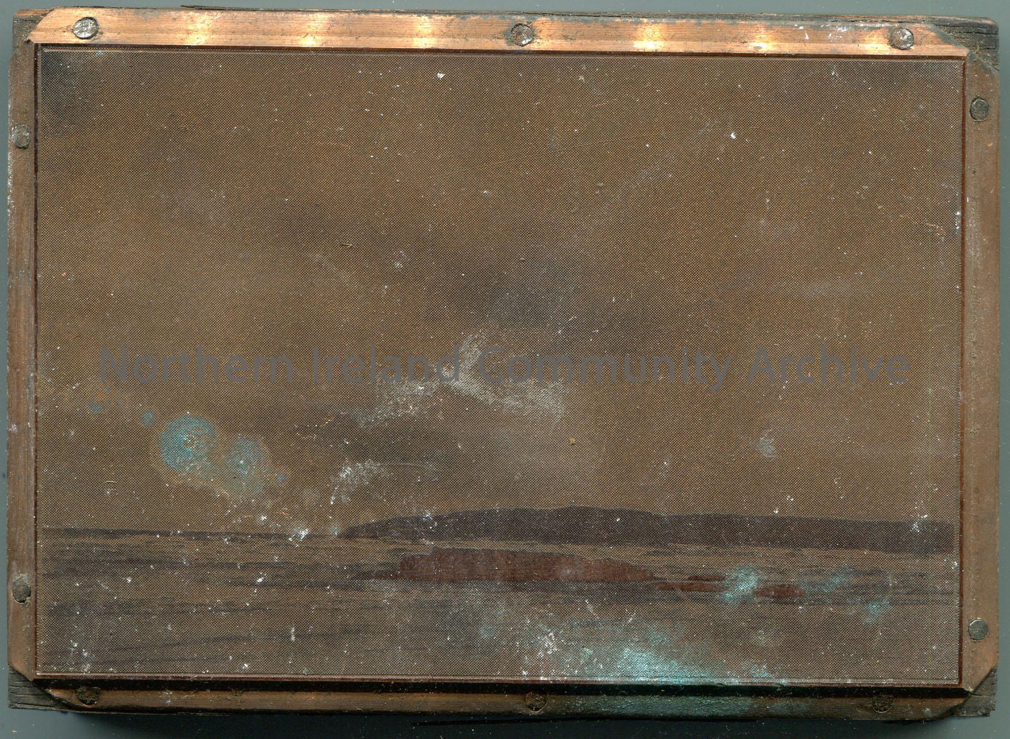 Rectangular wooden block with a metal plate nailed to it. Photographic image on metal of sea and sky, possibly of an island.