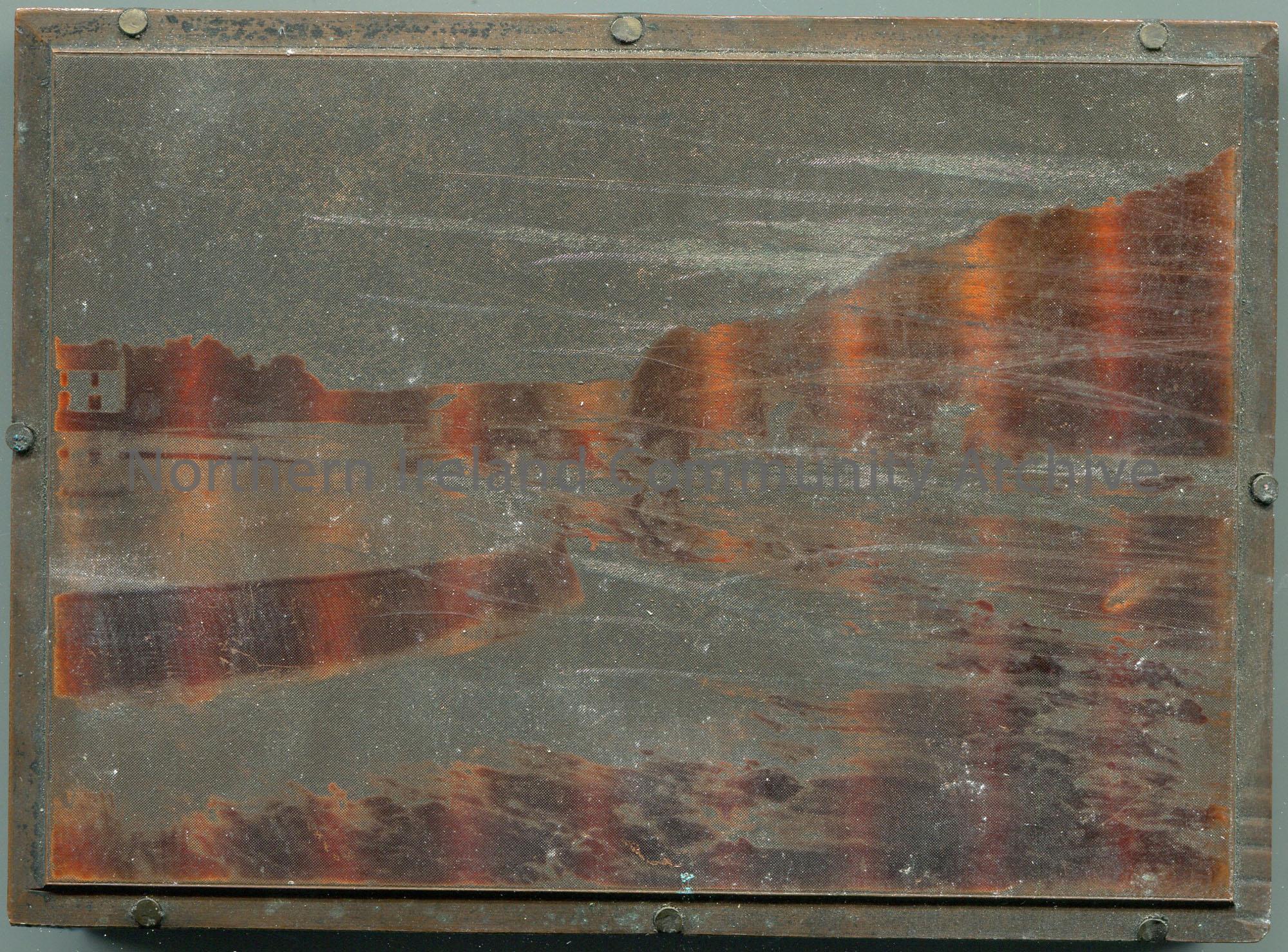 Rectangular wooden block with a metal plate nailed to it. Photographic image on metal of ‘The Cutts’ in Coleraine. Numbered 231.