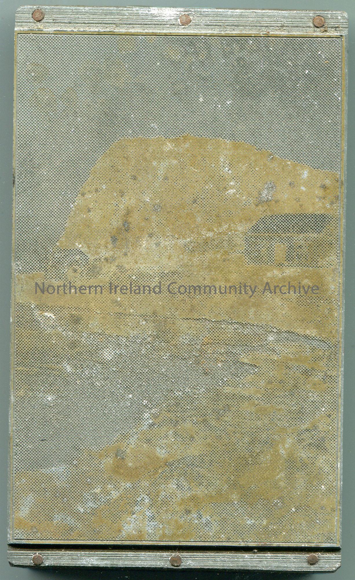 Rectangular wooden block with a metal plate nailed to it. Photographic image on metal of what appears to be a cliff with a cottage in the foreground. Number '92' handwritten in blue pencil onto a white label on one side of wooden block.