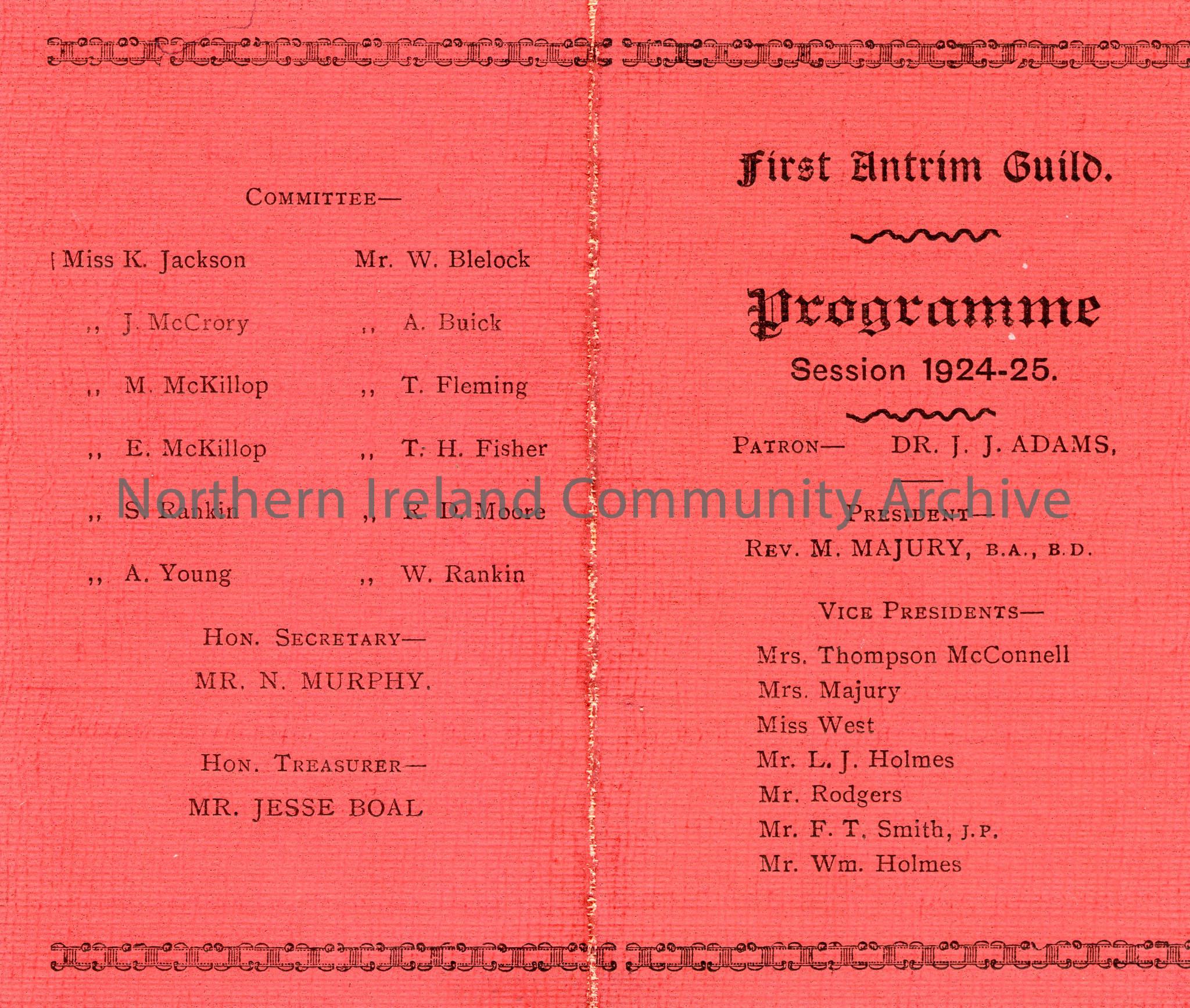 Red folded card. First Antrim Guild Programme Session 1924-25. Patron Dr. J.J. Adams. President Rev. M. Majury. List of Vice Presidents. Sam Henry lis…