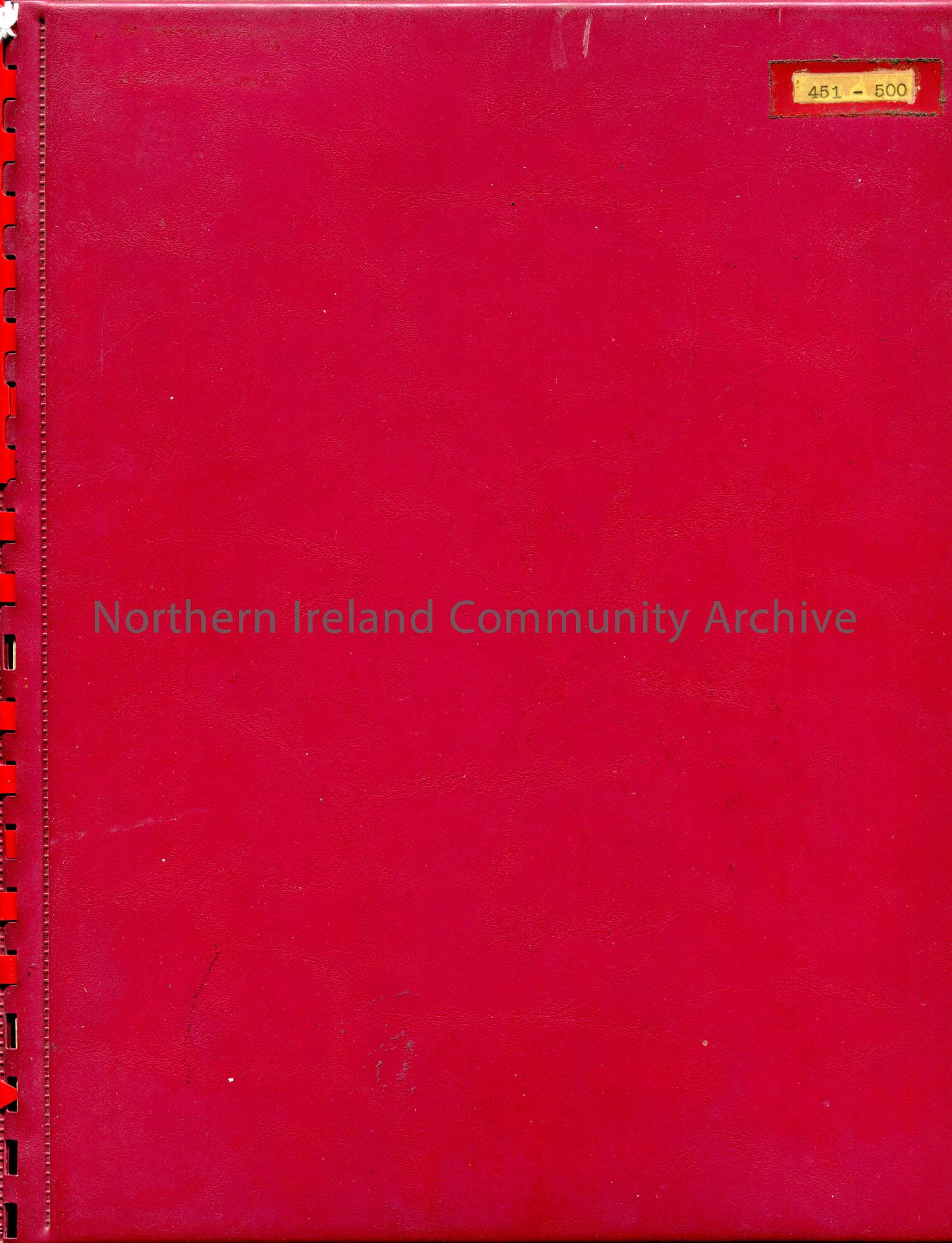 Red folder with paper pages attached to inside. Labelled ‘451-500’. Versions of folk songs are pasted to some of the pages.