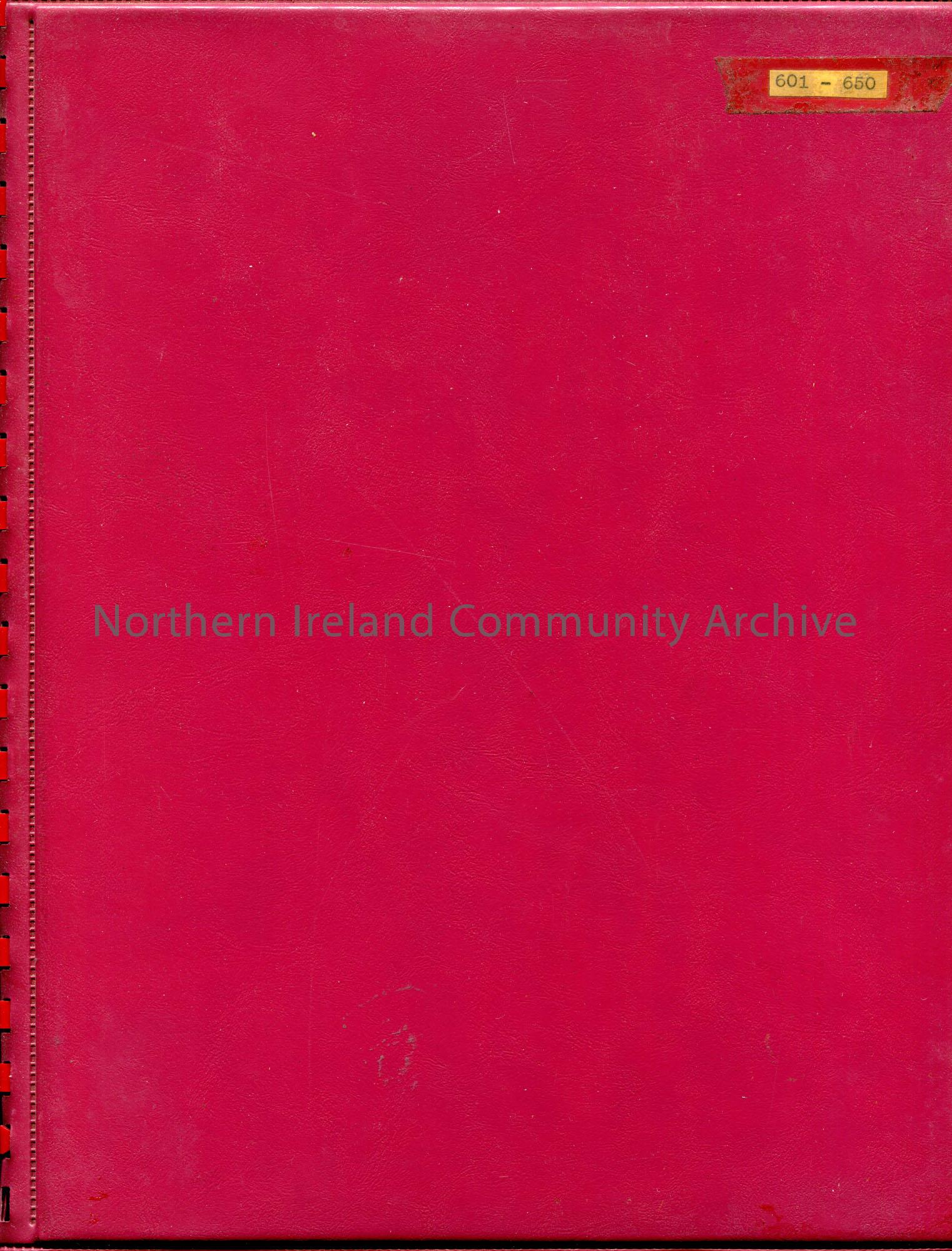 Red folder with paper pages attached to inside. Labelled ‘601-650’. Folk songs are pasted to some of the pages.