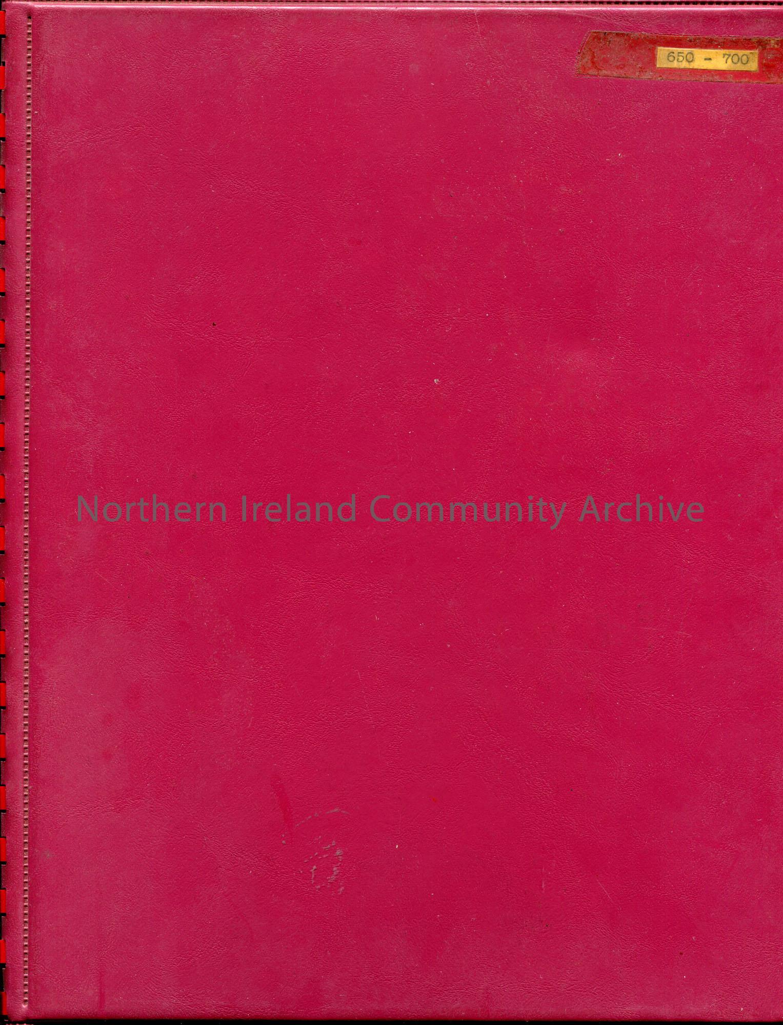 Red folder with paper pages attached to inside. Labelled ‘650-700’. Folk songs are pasted to some of the pages.