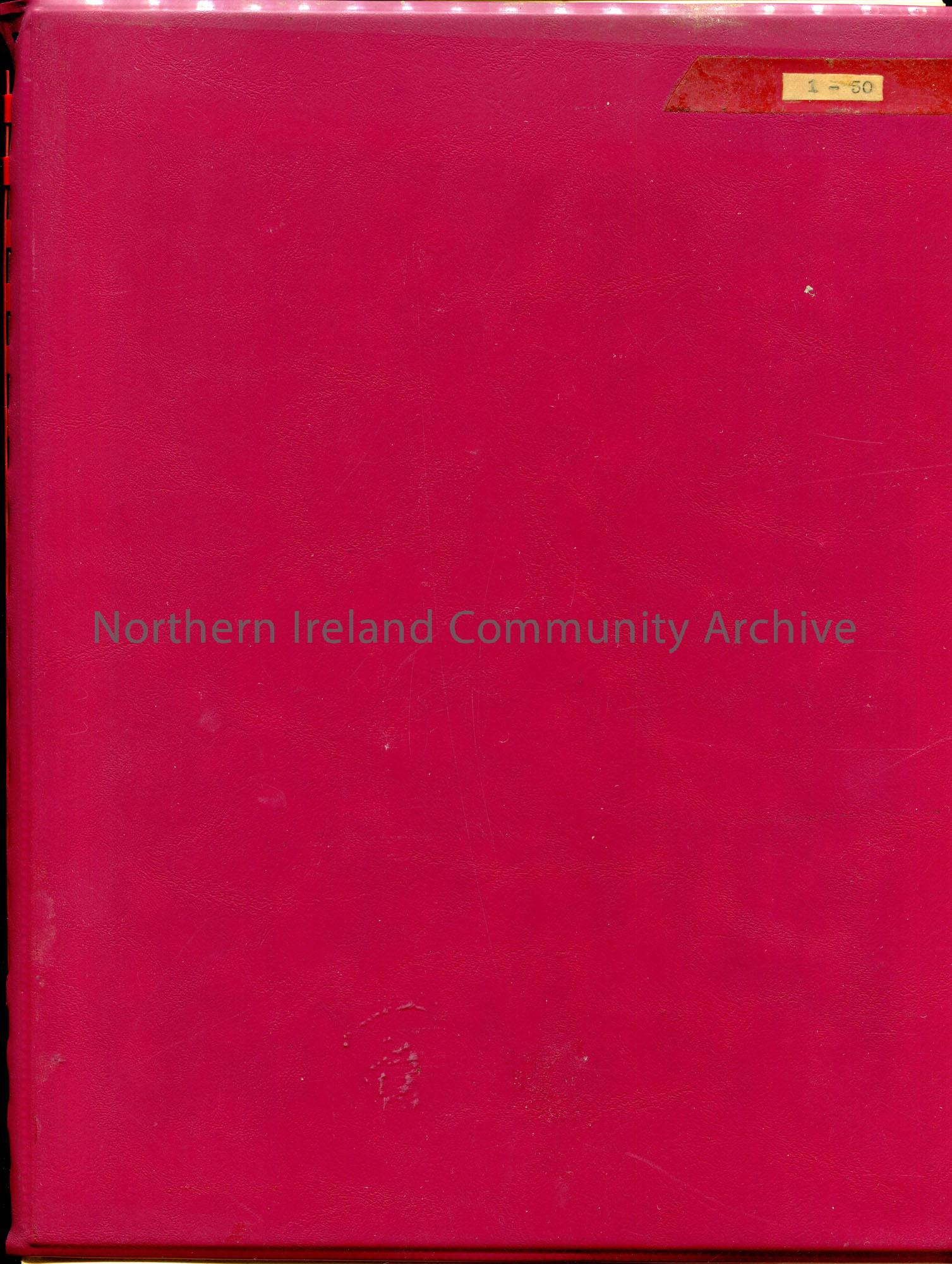 Red folder with paper pages attached to inside. Some of the pages have songs handwritten in pencil on them and others have pages pasted to them re songs. Folder numbered 1-50.