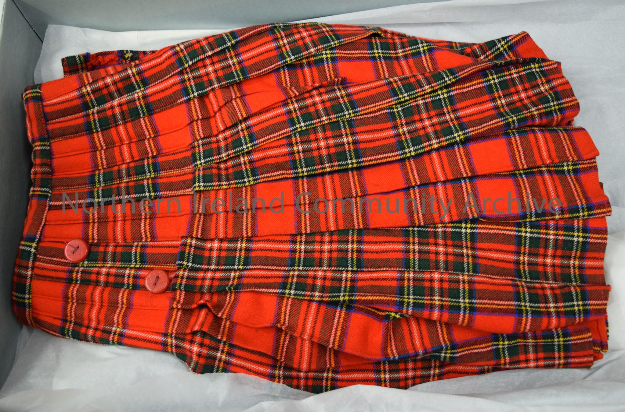 Red kilt with green, blue, black, yellow and white squared tartan pattern.