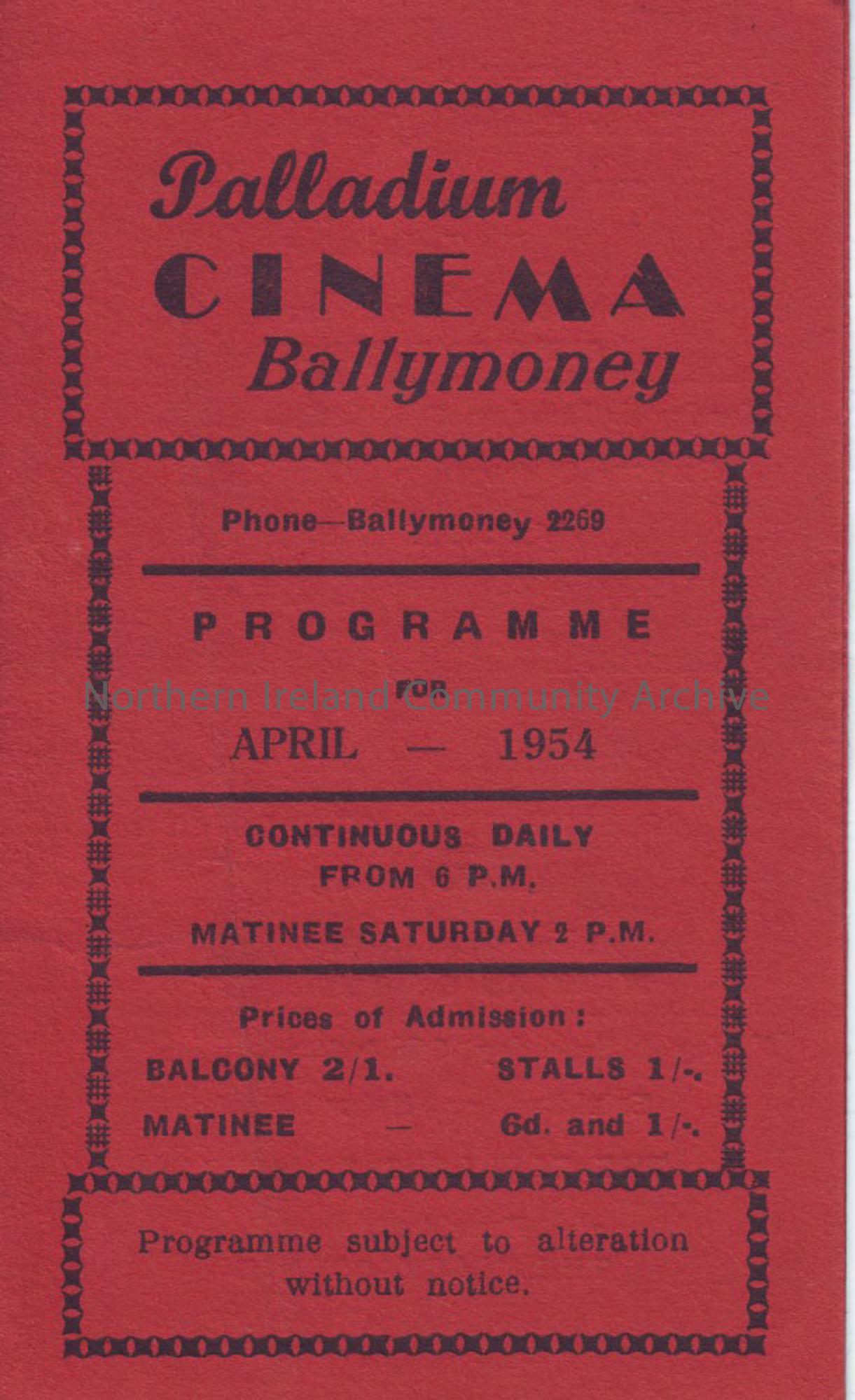 red monthly programme for Ballymoney Palladium cinema- April 1954