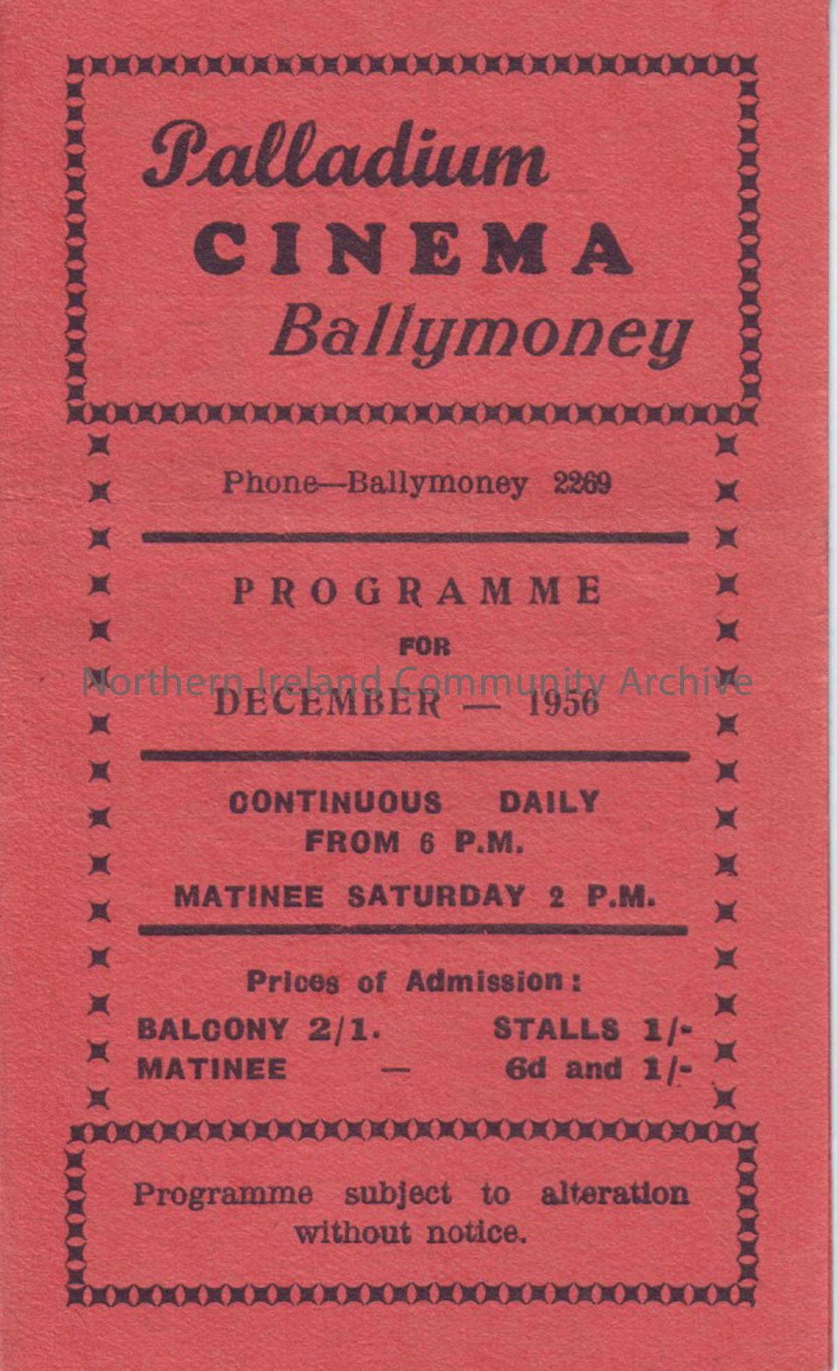 red monthly programme for Ballymoney Palladium cinema- December 1956