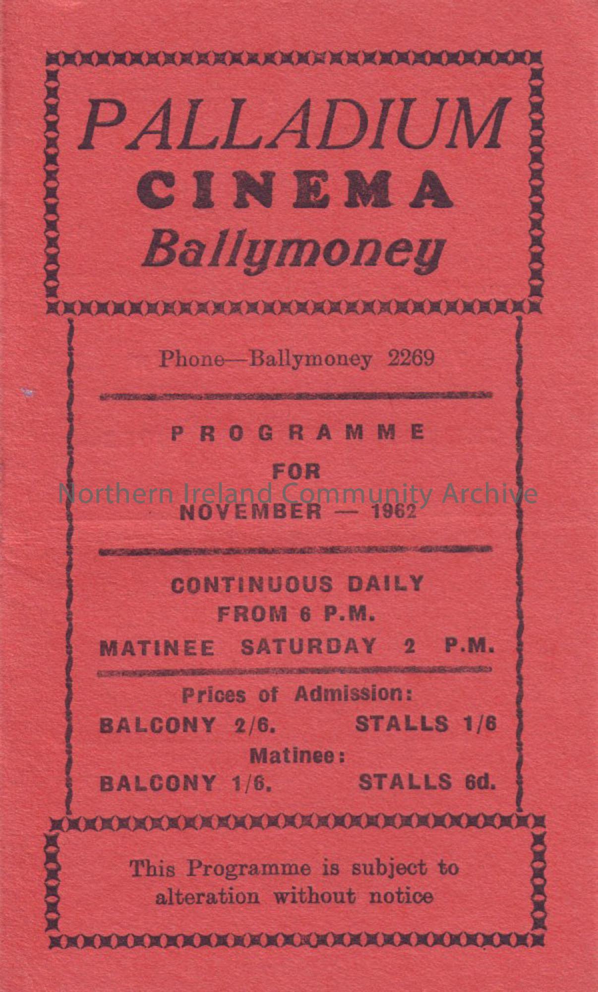 red monthly programme for Ballymoney Palladium cinema- November 1962