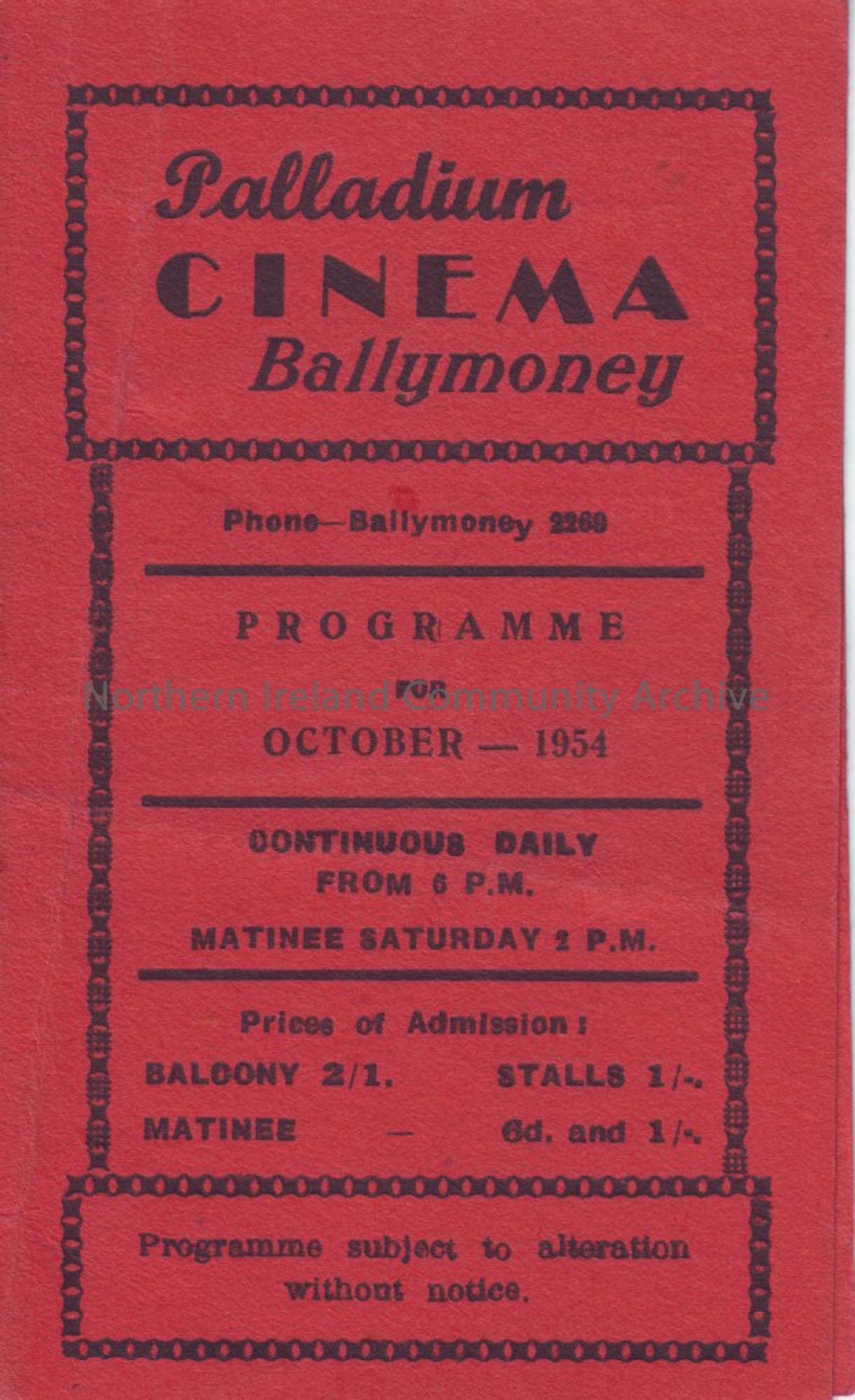 red monthly programme for Ballymoney Palladium cinema- October 1954