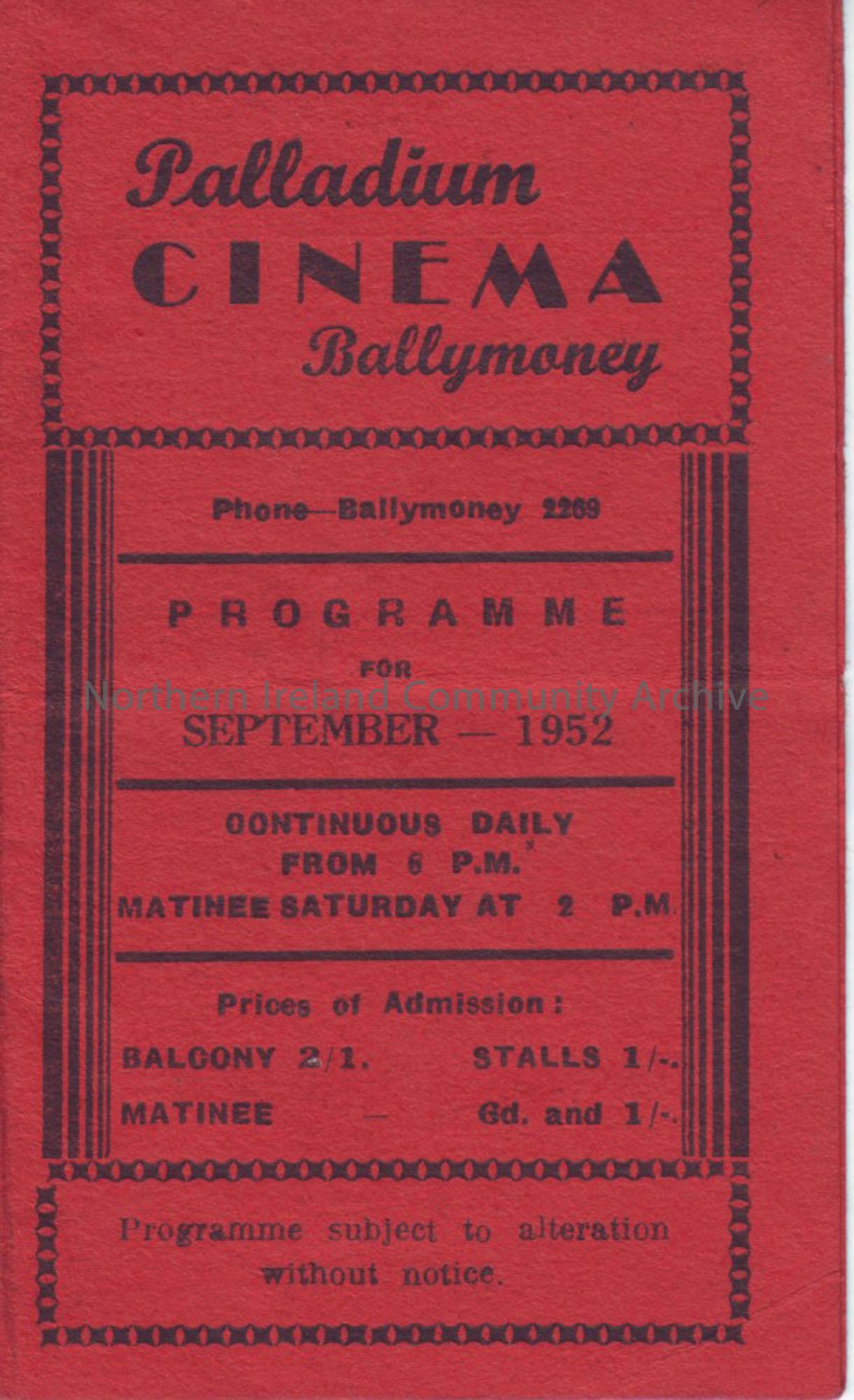 red monthly programme for Ballymoney Palladium cinema- September 1952