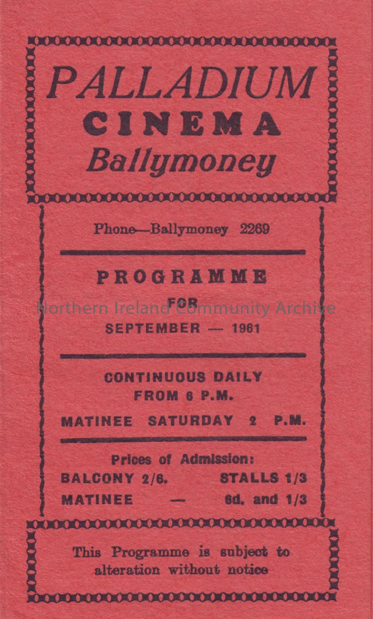 red monthly programme for Ballymoney Palladium cinema- September 1961