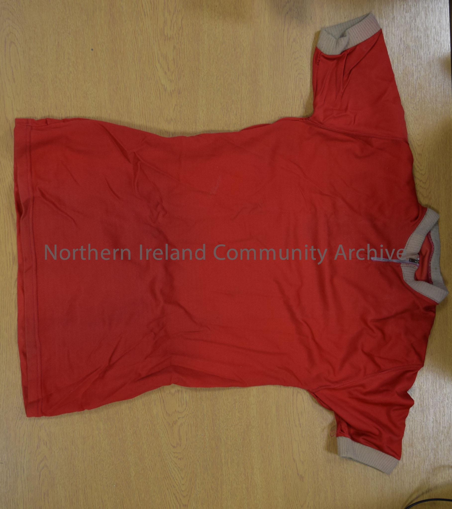 Red Route Wheelers cycling jersey with cream trim around the collar and sleeves. Elasticated pouch on the back. – 2015.24