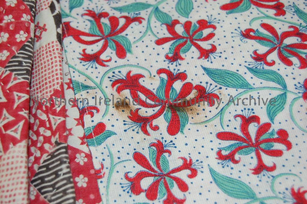 red/brown, red/green patchwork quilt. One side is red/ brown patchwork and the other is a red/green floral pattern. – 2010.599 (2)