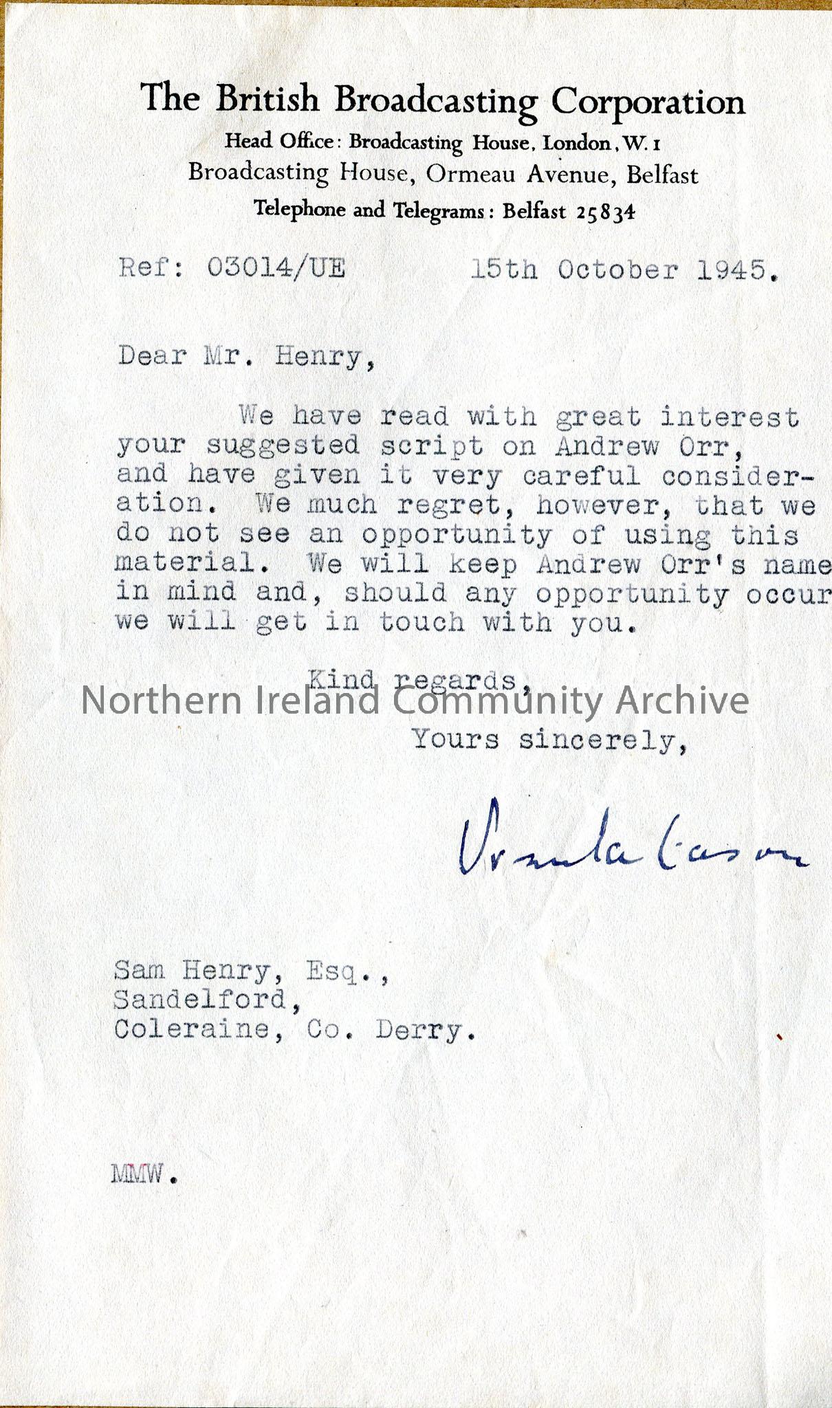 Refusal letter from BBC for a broadcast script on Andrew Orr