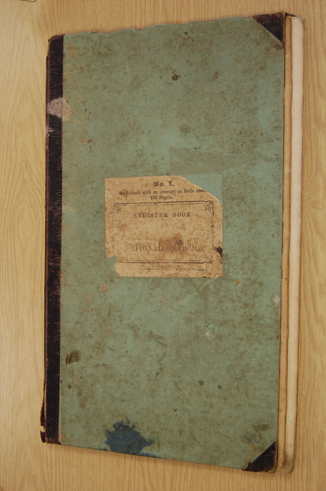 Register book National Schools. No 1 for schools with an average on Rolls under 150 pupils. Green book with brown and brown sticker on front.