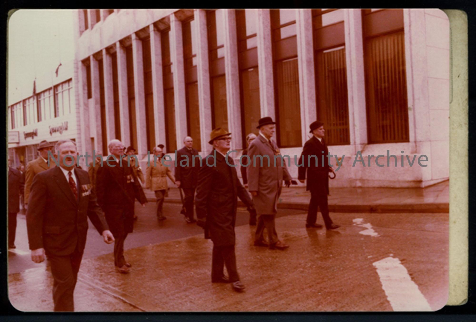 Colour photograph of a Remembrance Parade on Queen's Street, Coleraine. G Turkington; F Walls; xxx; D Pringle; Towser Bradley; Bobby McDonald; xxx; Roy Simpson; T McDonald; B Clarke; WT McKee.