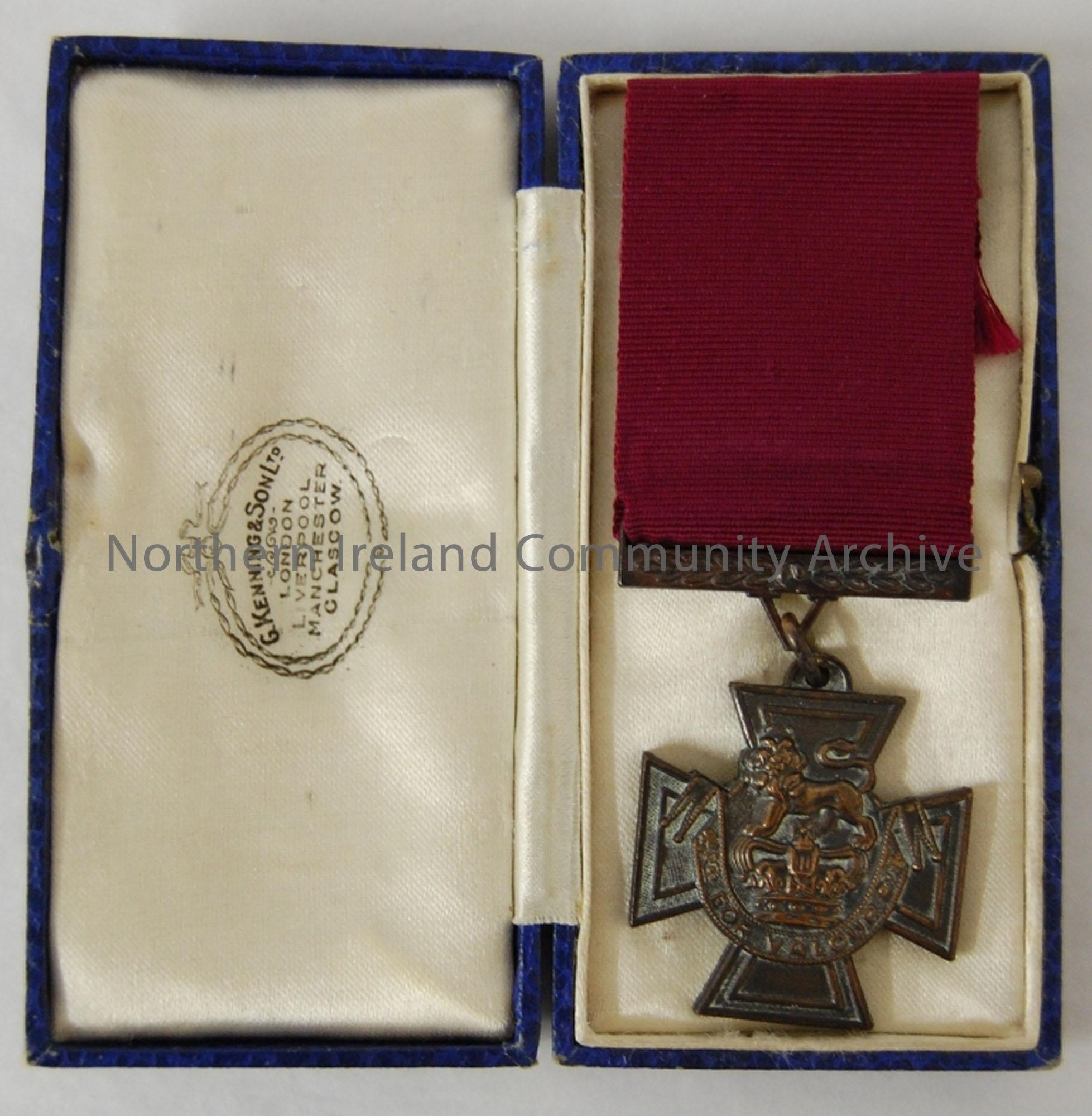 replica Victoria Cross with burgundy ribbon. “copy” engraved on reverse. Contained in blue case with white satin interior