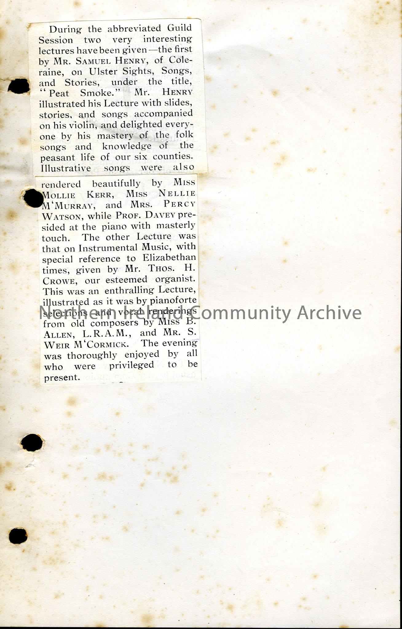 Report on two lectures, one by Sam Henry on Ulster Sights, Songs and Stories titled ‘Peat Smoke’, accompanied by Miss Mollie Kerr, Miss Nellie McMurra…