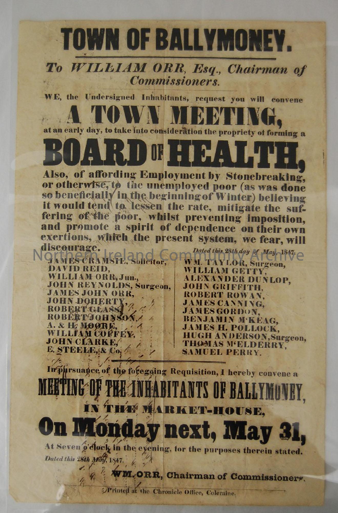 Requesting formation of Board of Health, Ballymoney 1847. 'Town of Ballymoney./To William Orr Esq., Chairman of/Commissioners/We, the undersigned inhabitants, request you will convene/A Town Meeting,/at an early day, to take into consideration the propriety of forming a/Board of Health.../Meeting of the inhabitants of Ballymoney,/in the Market-House,/On Monday next, 31 May,/...Dated this 28th May 1847..' plan to give poor work, e.g. stone breaking, to lessen their suffering and 'promote a spirit of dependence on their own exertions'