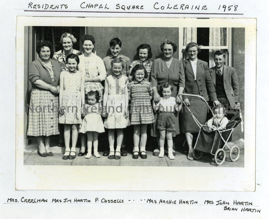 Residents, Chapel Square, Cloeraine, 1958. Mrs Creelman, Mrs Jim Hartin, P.Cassells, Mrs Archie Hartin, Mrs John Hartin, Brian Hartin
