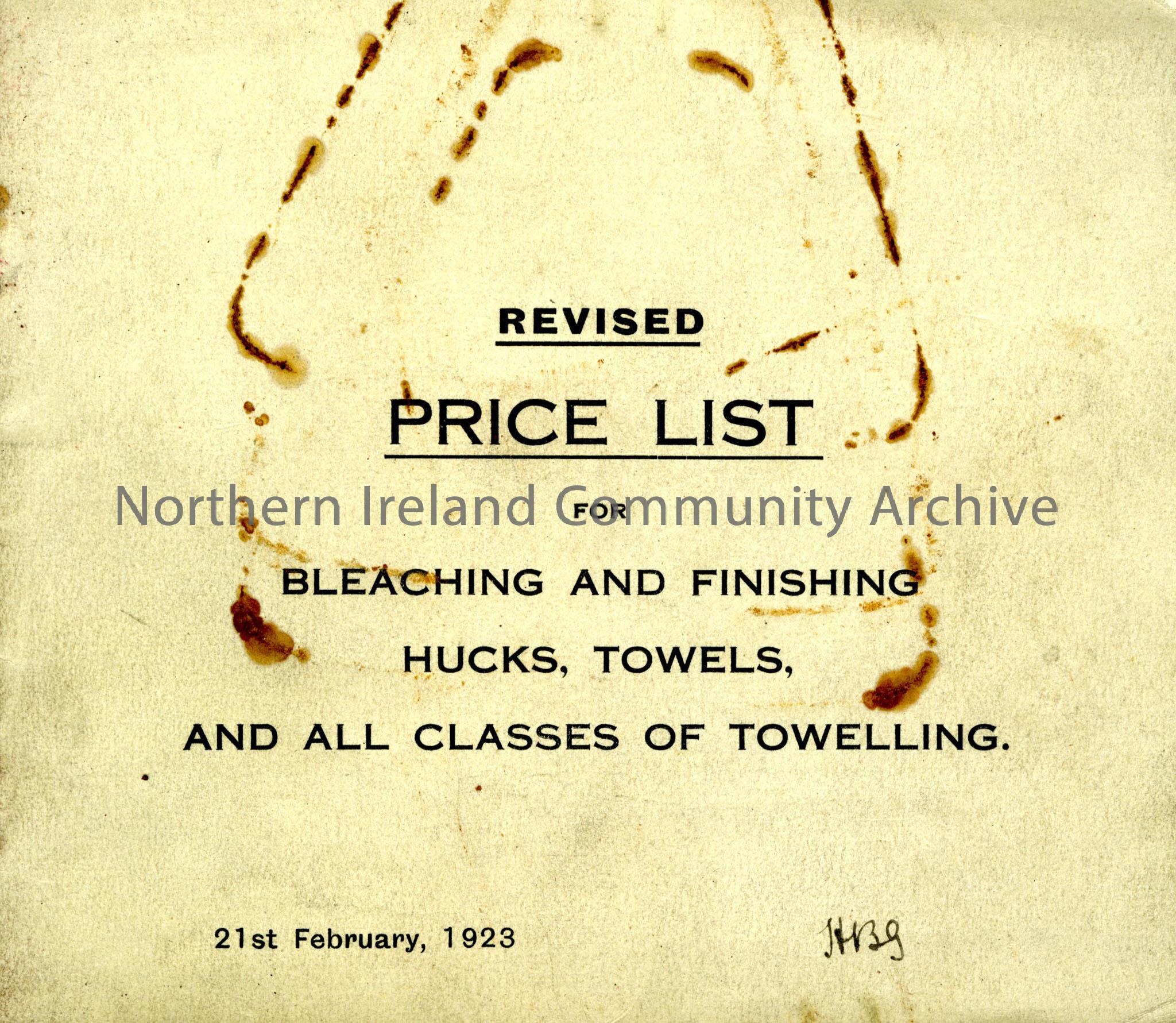 ‘Revised price list for Bleaching and Finishing Hucks, towels and all classes of towelling.’ Dated 21st February 1923. ‘H.B.G’? handwritten on front c…