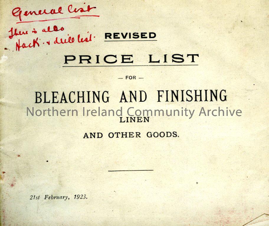 ‘Revised price list for Bleaching and Finishing Linen and other goods.’ Dated 21st February 1923. Handwritten on the front is ‘General list. There is …