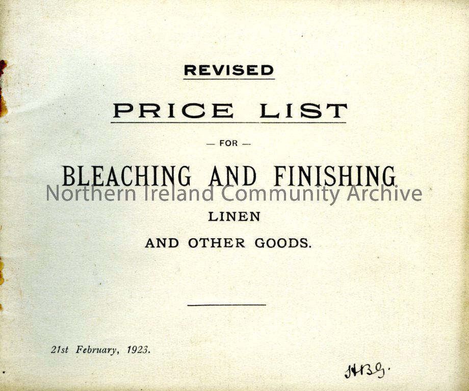 ‘Revised price list for Bleaching and Finishing Linen and other goods.’ Dated 21st February 1923. ‘H.B.G’? handwritten on front cover.