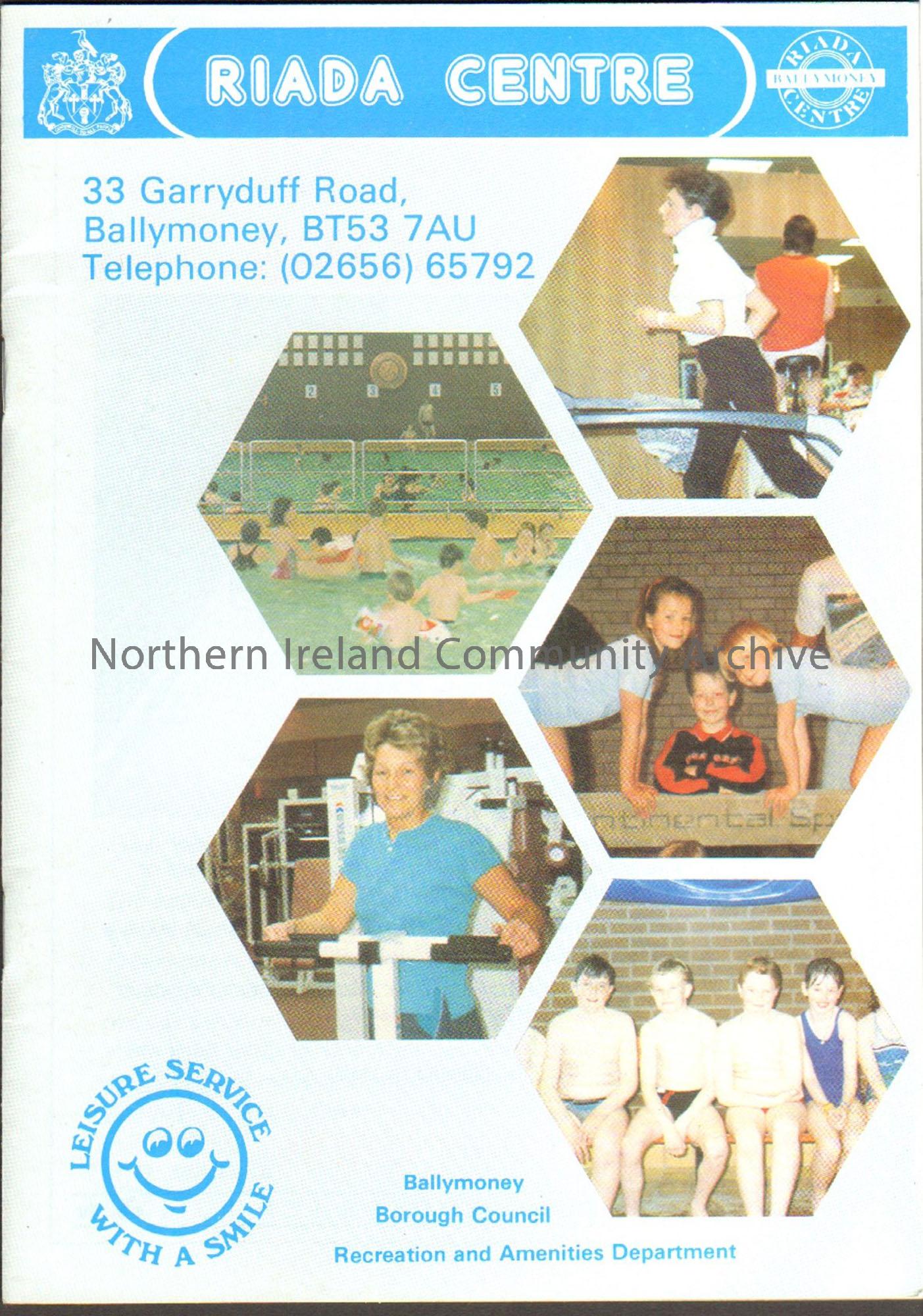 Riada Centre. Light blue cover with hexagon shaped photographs of the swimming pool, someone jogging, two children on a balancing beam, a lady on a gym machine and some children by the pool