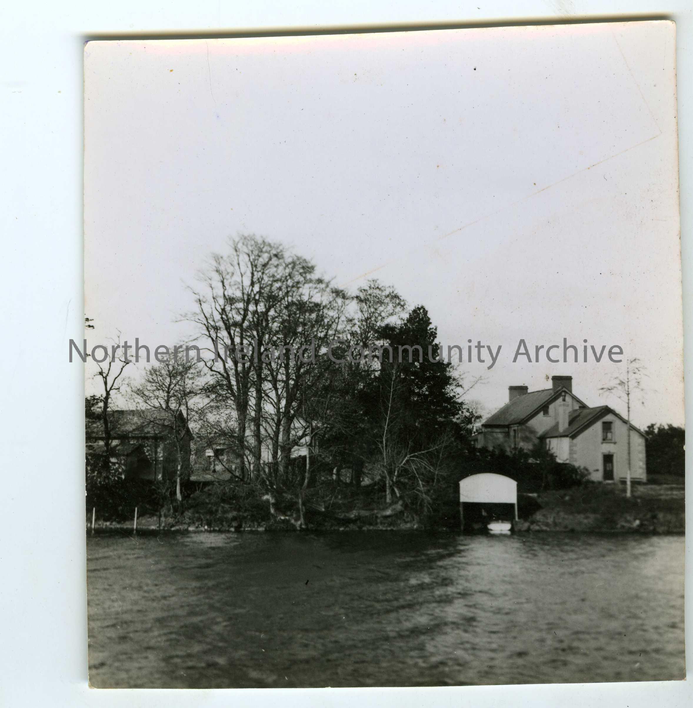 Riverbank featuring a shelter for boats, tall trees and buildings.