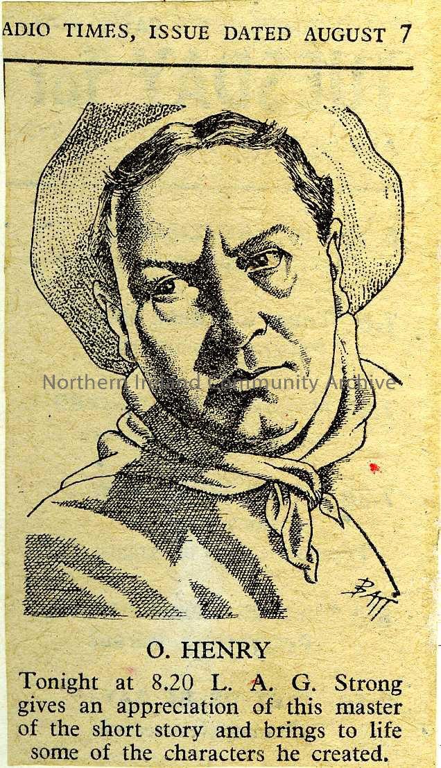 Roads of Destiny - a book of short stories by the USA born writer William Sydney Porter, who used the pen name O. Henry. Radio Times extract, with sketch of author, glued to inside of front cover