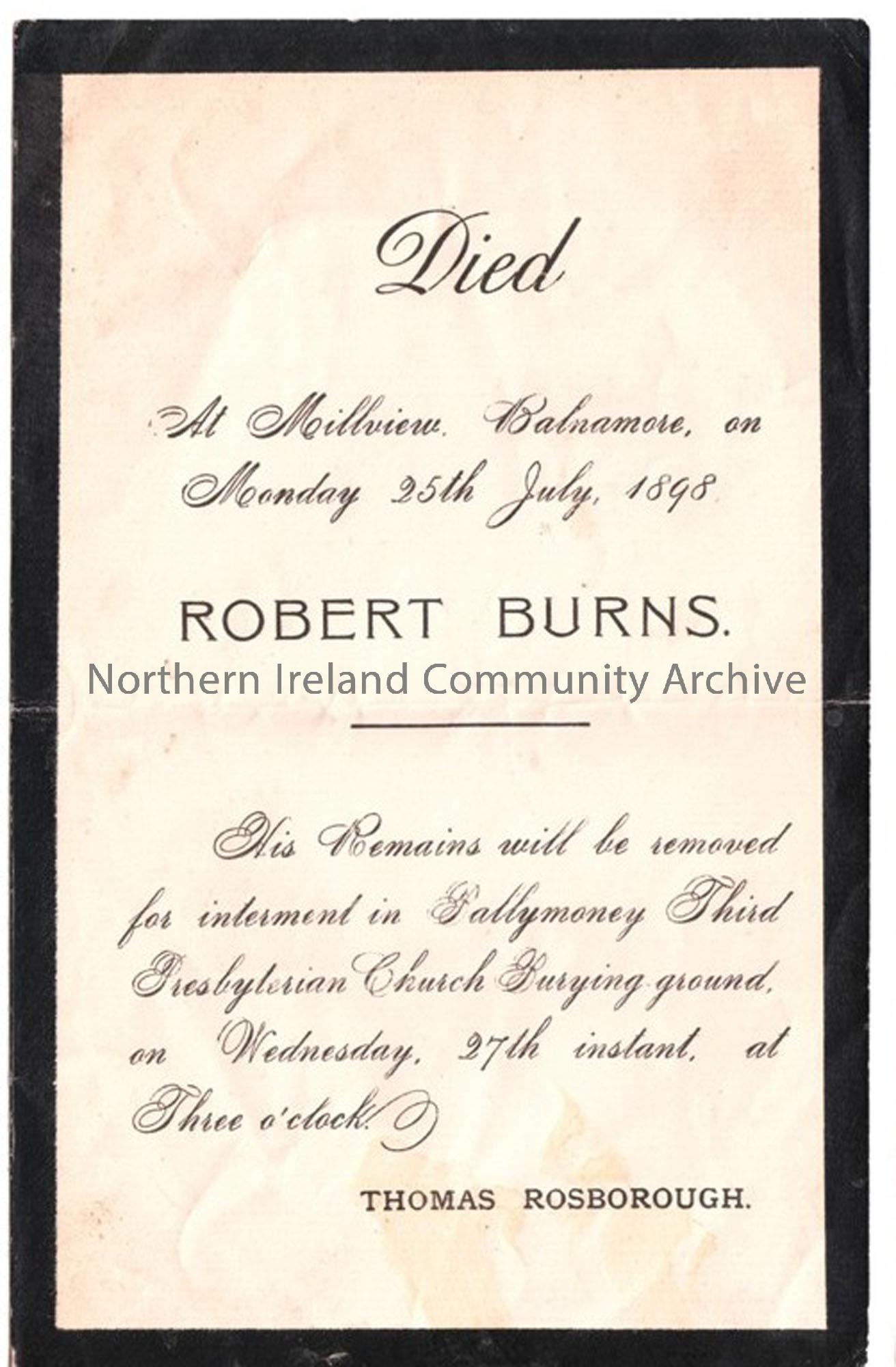 Robert Burns of Balnamore, buried in Third Presbyterian Church Ground, Ballymoney d.25th July 1898