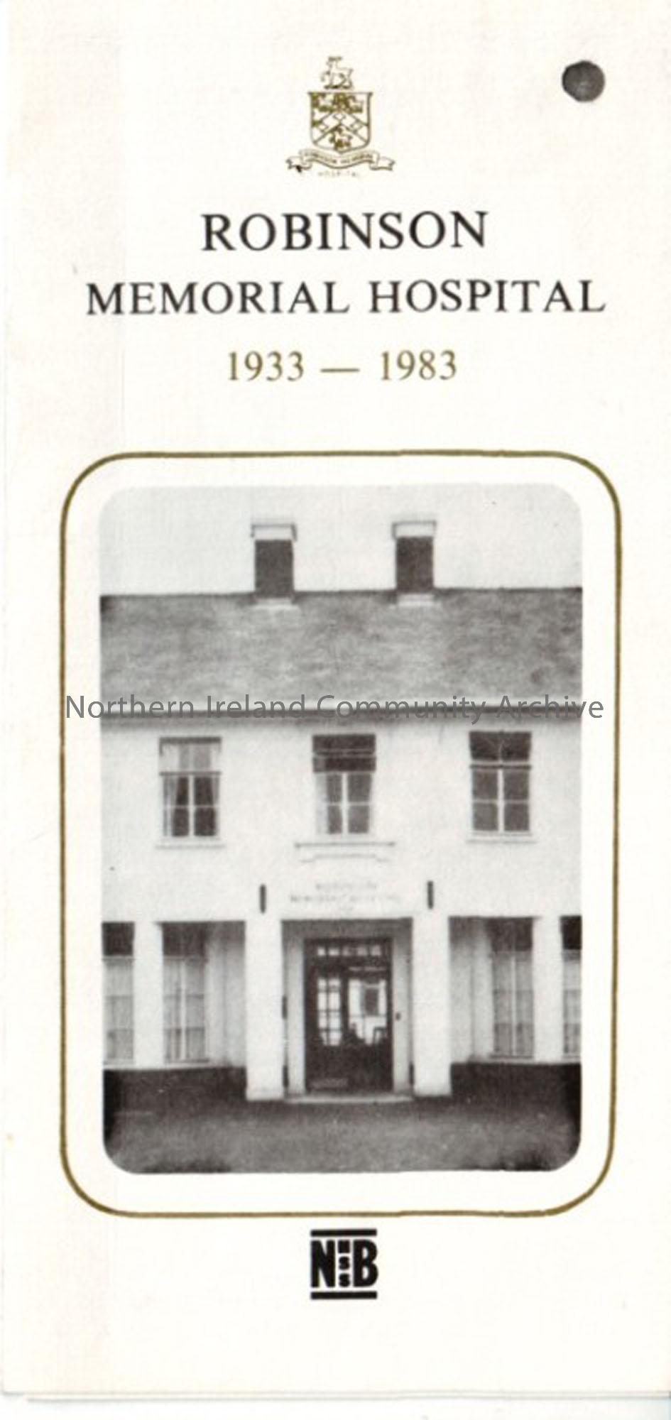 Robinson Memorial Hospital 1933-1983 leaflet showing a photograph of the hospital during construction and a photograph of Mr Samuel Robinson and his w…