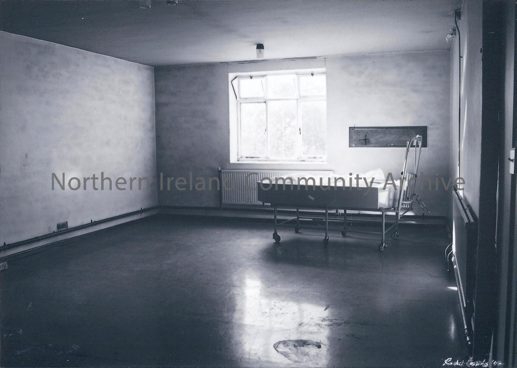 Metal bed for washing patients;with caption:'One of the few reminders of hospital life'