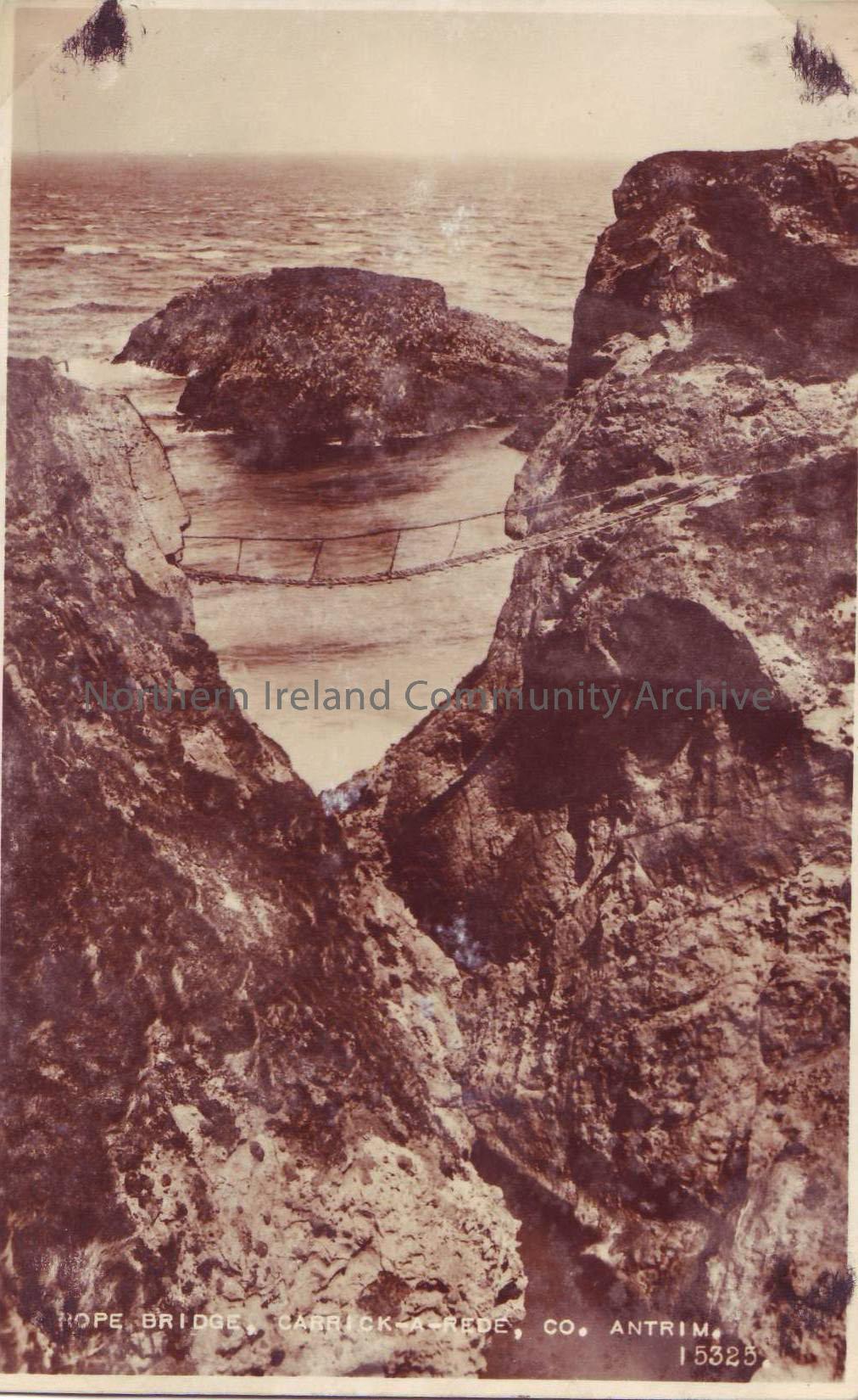 postcard depicting the rope bridge at Carrick-a-rede County Antrim. With sea in background and cliffs