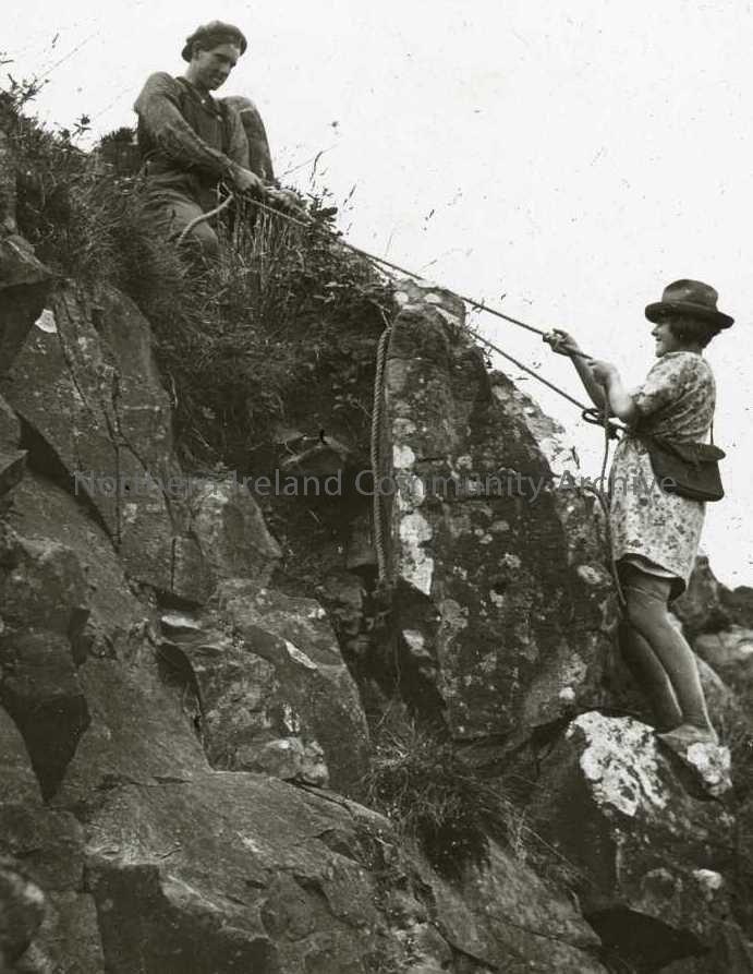 Woman (Rosie McFaul) climbing rockface attached to rope, man at top as anchor. (JM - Rosie McFaul, Rathlin 1932, climbing for gulls' eggs, anchored by her brother Neil)