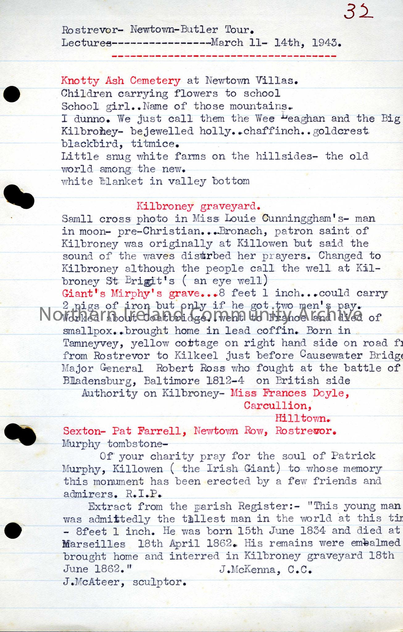 Rostrevor- Newtown-Butler Tour – Lectures March 11-14th, 1943. Notes on Knotty Ash cemetery,Kilbroney graveyard and Patrick Murphy, the Irish Giant. M…