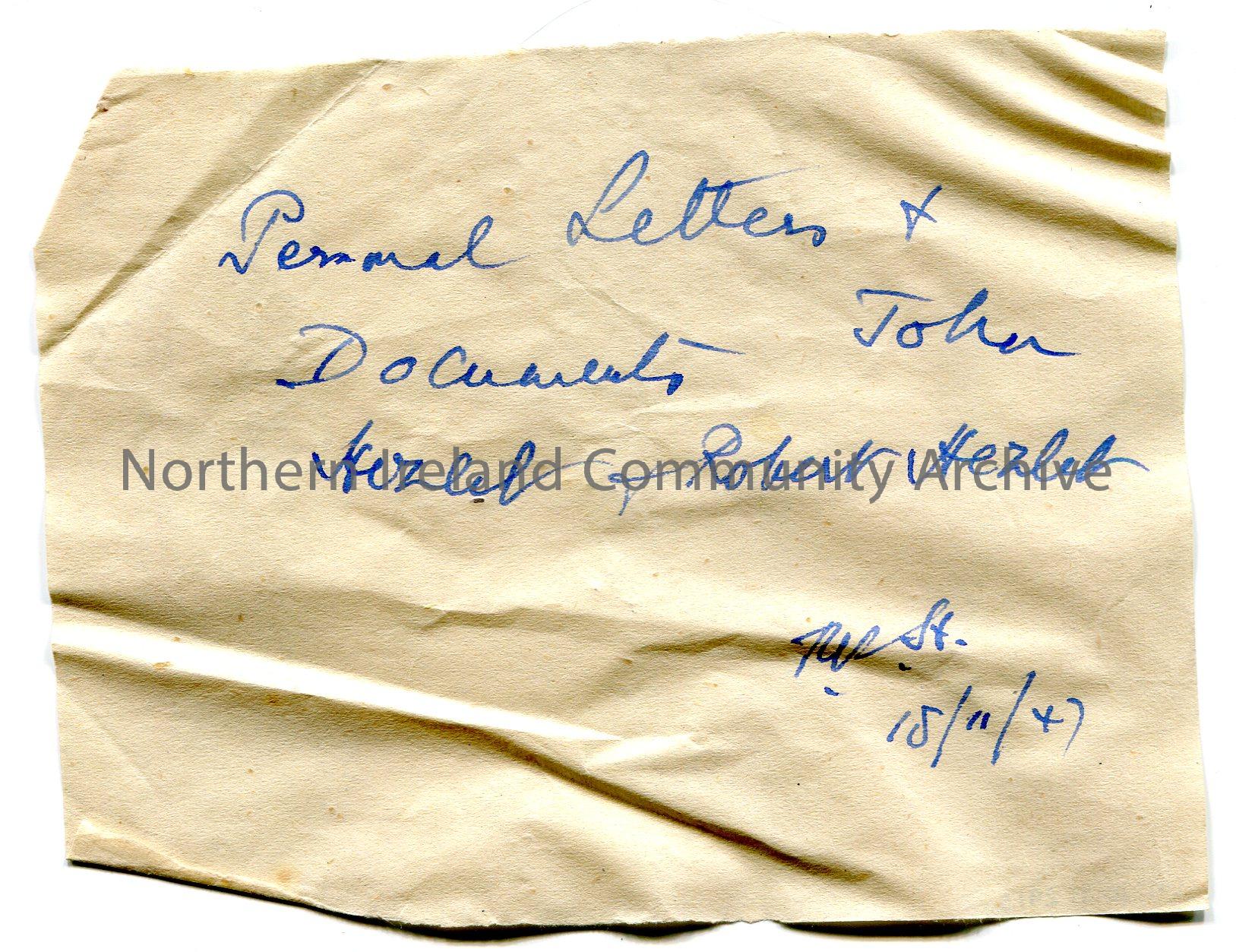 Rough note handwritten in blue ink on scrap of paper stating, 'Personal Letters & Documents John Hezlet & Robert Hezlet'. Possibly signed which is illegible. Dated 18th November, 1947.