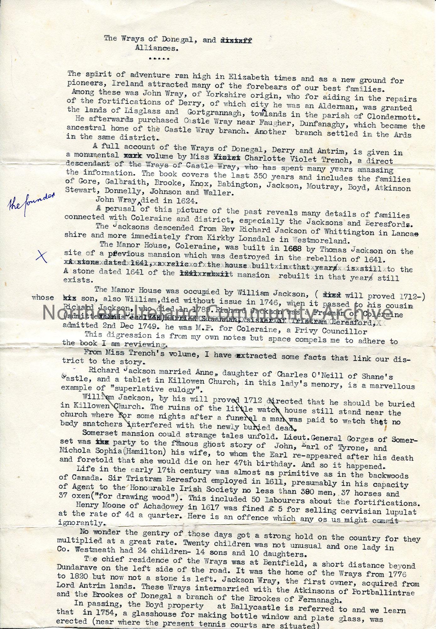 Rough typed draft for an article. Titled, 'The Wrays of Donegal, and Alliances'. Re a review by Sam Henry of a book by C. V. Trench titled, 'The Wrays of Donegal'. Refers to the Jacksons and Beresfords, Coleraine. Mentions the Manor House at Coleraine, Somerset mansion, Coleraine and Boyd property at Ballycastle.