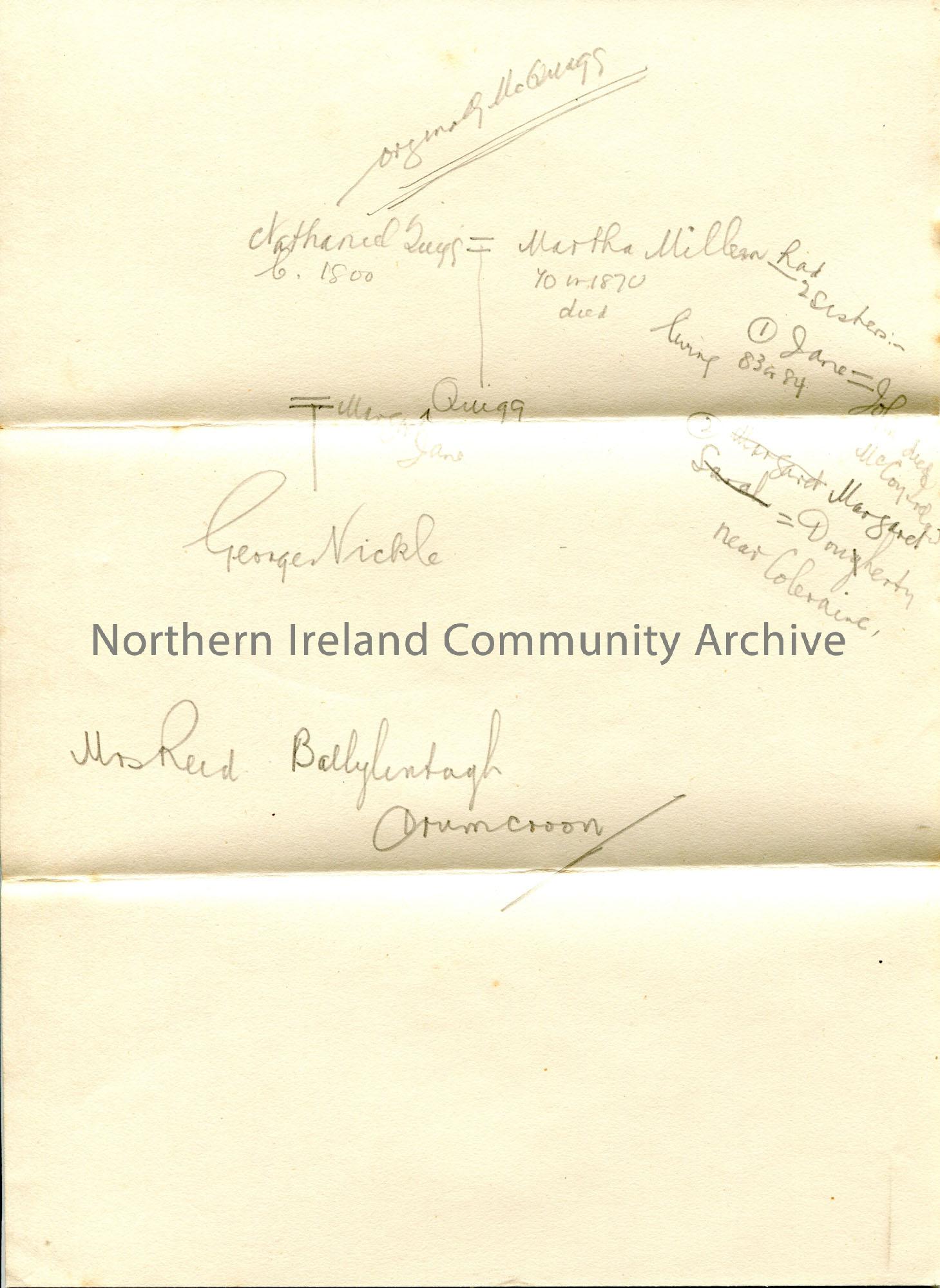 Roughly, hand drawn family tree in pencil. Re Quigg family name. Includes George Nickle. ‘Mrs Reid, Ballylintagh, Drumcroon’ handwritten in pencil bel…