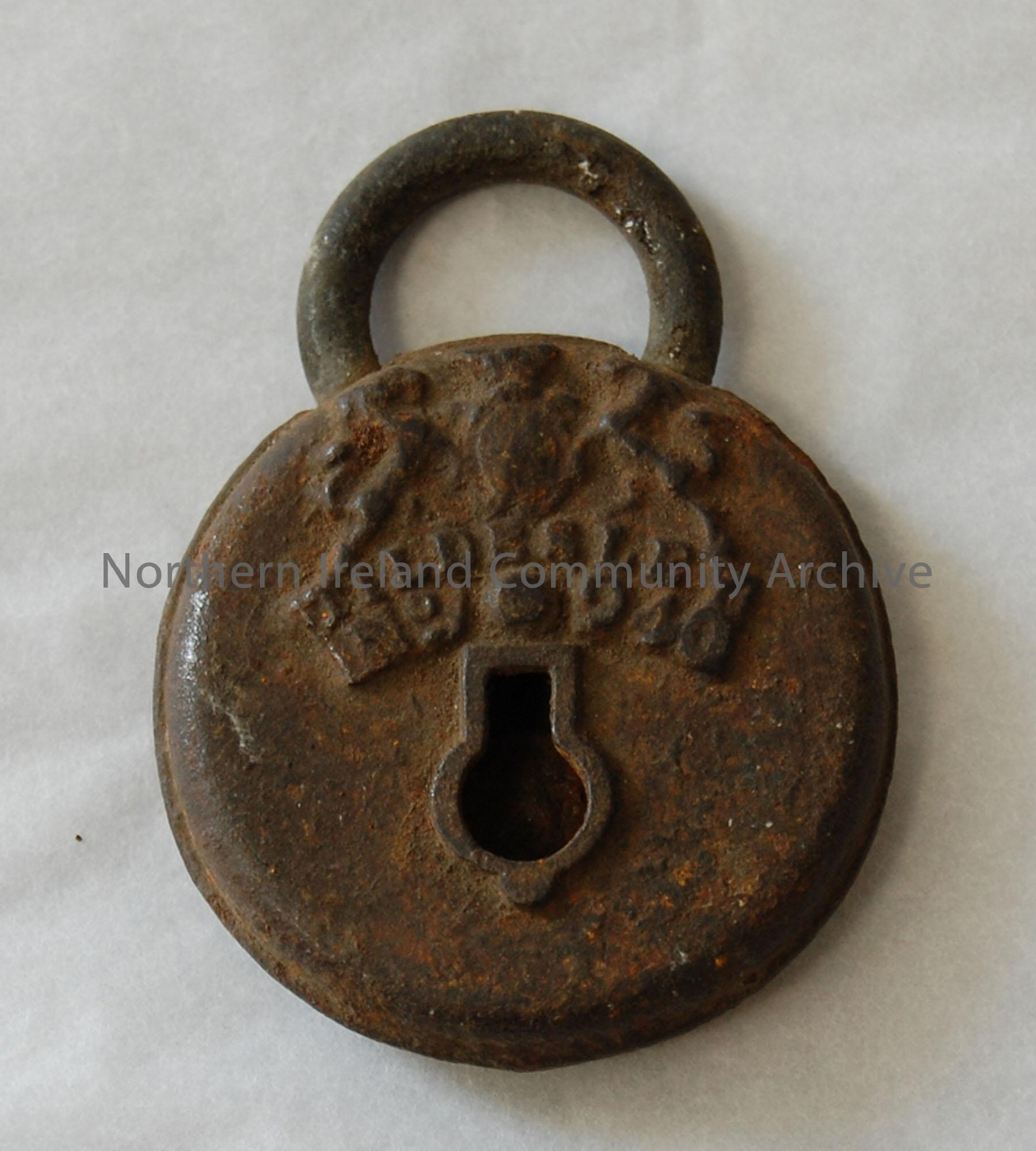 Round padlock with upturned keyhole and coat of arms and printing on one side.